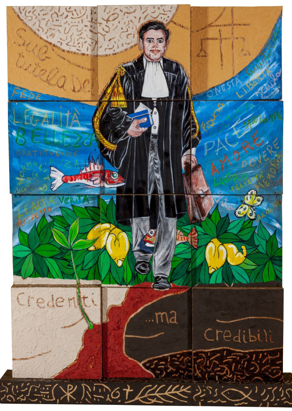 L’opera raffigura il giudice Livatino (realizzato da Arokiasamy Jayasoosai Maria Nathan) con in mano la sua agenda dalla quale sbuca un foglietto con scritto in cima “Std” (come nell’immagine ufficiale del beato), in posizione dinamica mentre avanza in un giardino di limoni e animali (realizzato da Proietto Giovanni e Lee Domenique Proietto).Il giudice incede tra il giardino e un paesaggio bianco rosso e nero con incisa la crasi di un suo pensiero: “credenti… ma credibili”. Ricordando la definizione di Gesualdo Bufalino: “Sicilia terra di luce e lutto”  e in mezzo il sangue del martire dal quale sboccia una nuova pianta.