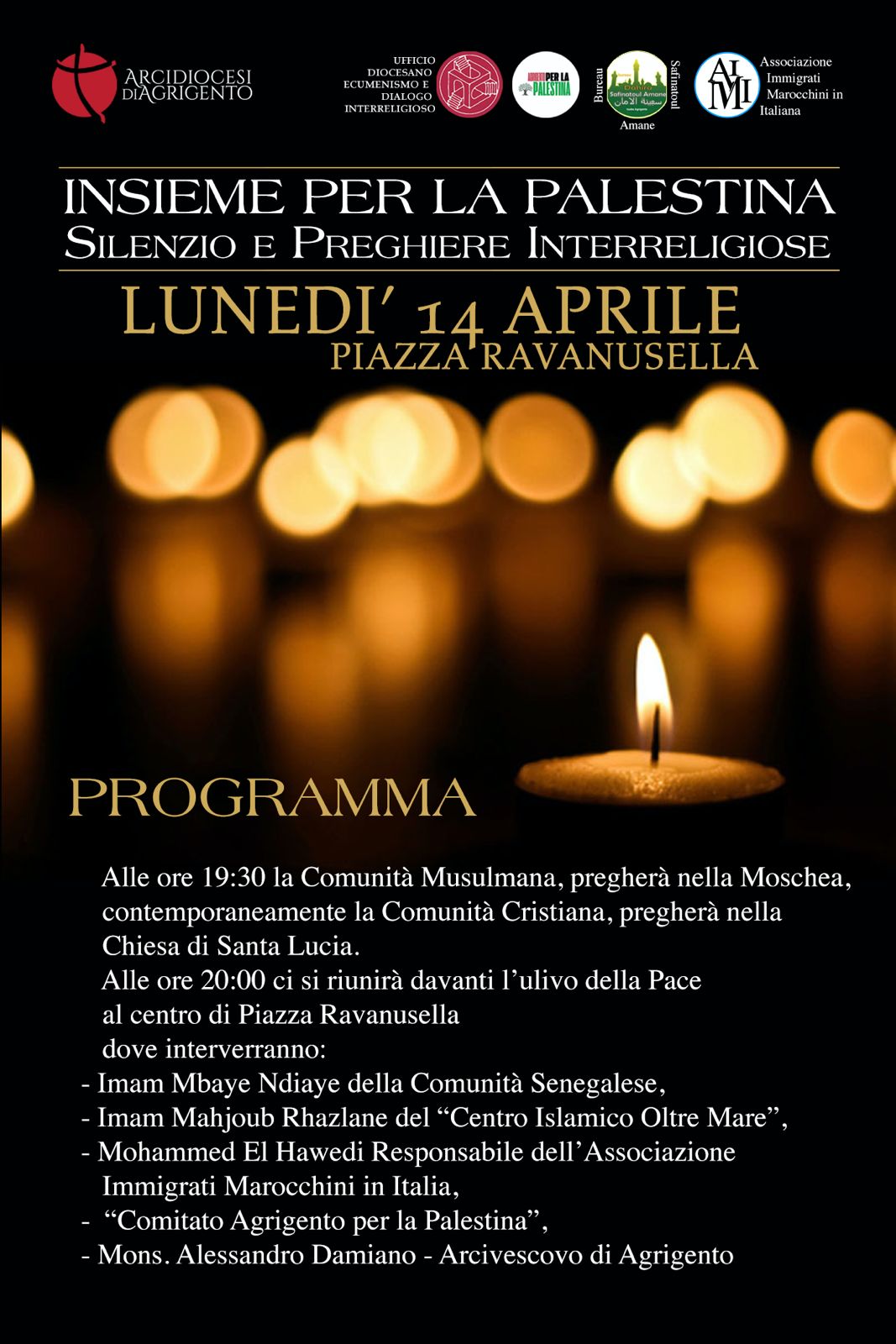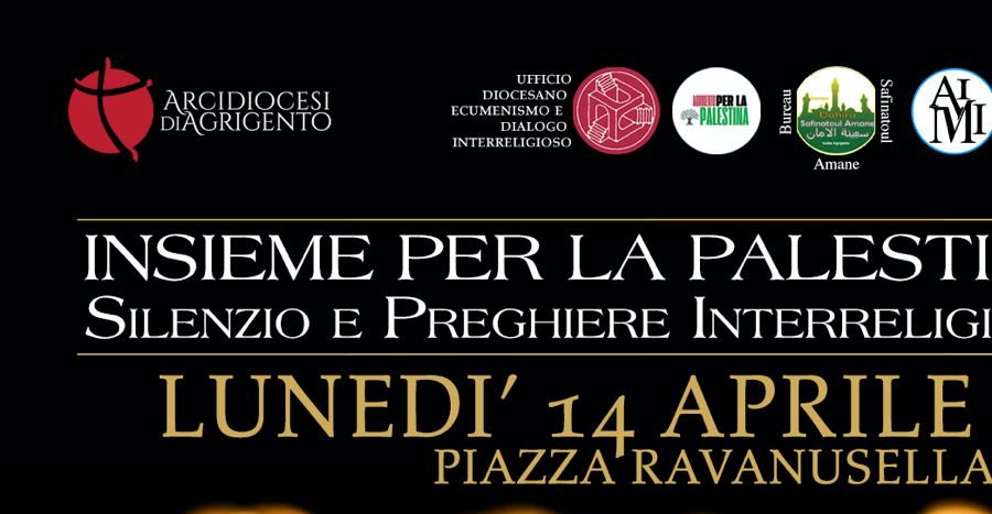 “Insieme per la Palestina silenzio e preghiere Interreligiose” è il tema dell’iniziativa che si terrà lunedì 14 aprile in Piazza Ravanusella ad Agrigento (vedi programma)