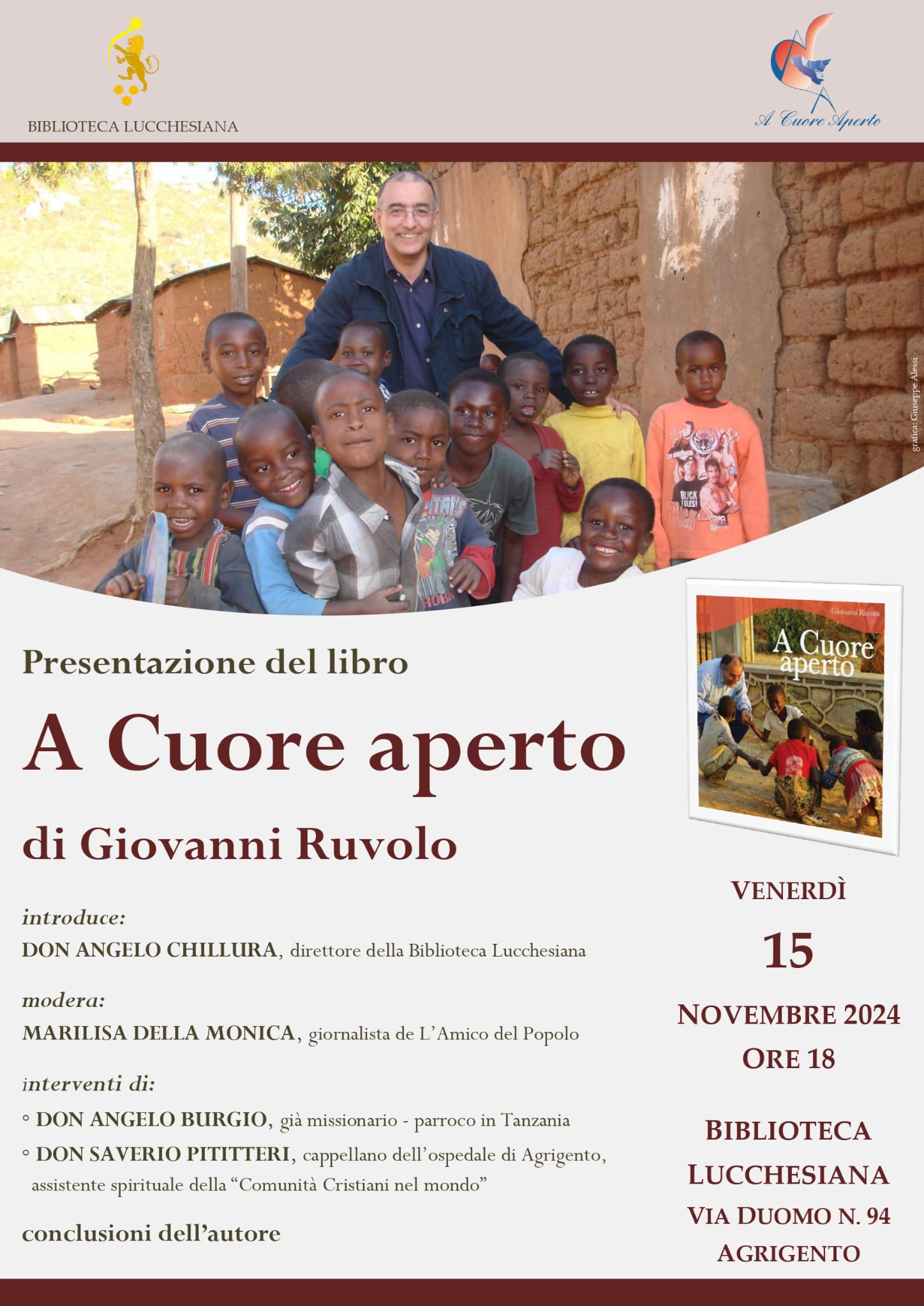 Venerdì 15 novembre 2024, nella sala monumentale della Biblioteca Lucchesiana di Agrigento è stato  presentato il libro “A Cuore aperto” del cardiochirurgo Giovanni Ruvolo che racconta vent’anni di volontariato sanitario e sociale tra la Sicilia, Tanzania e Ucraina.