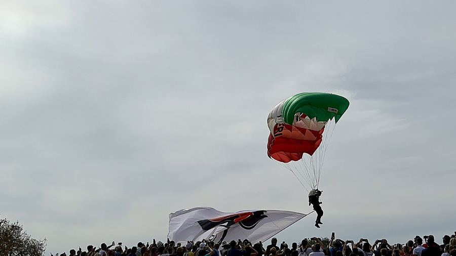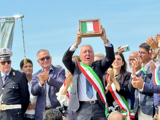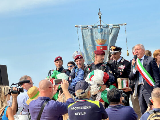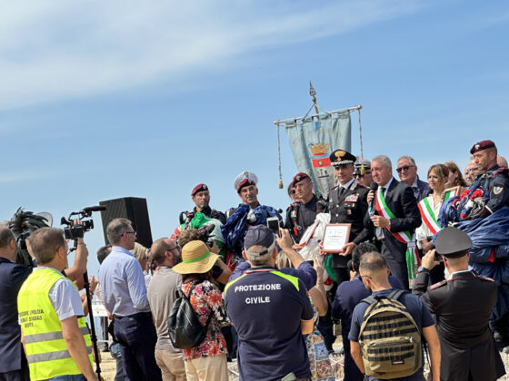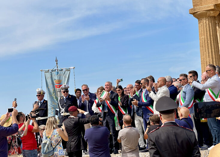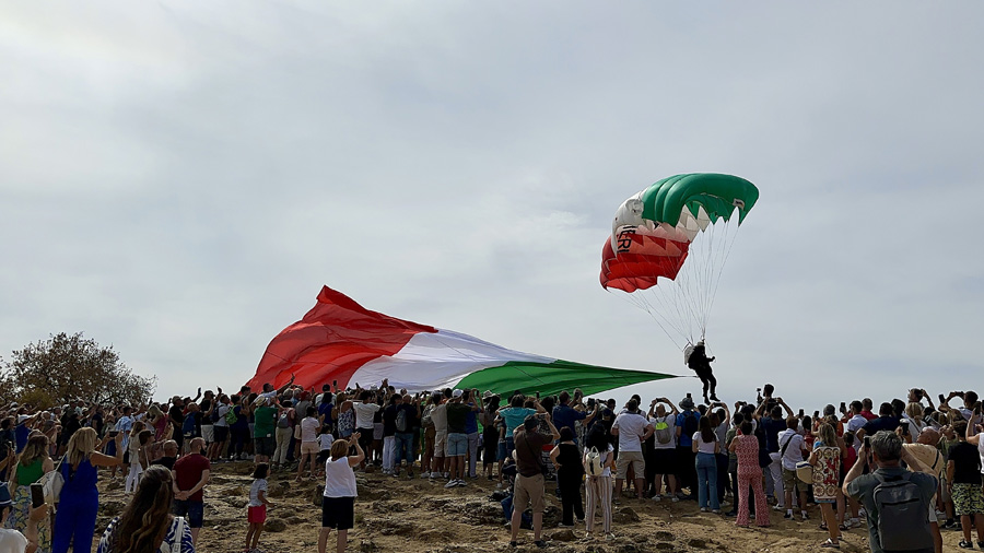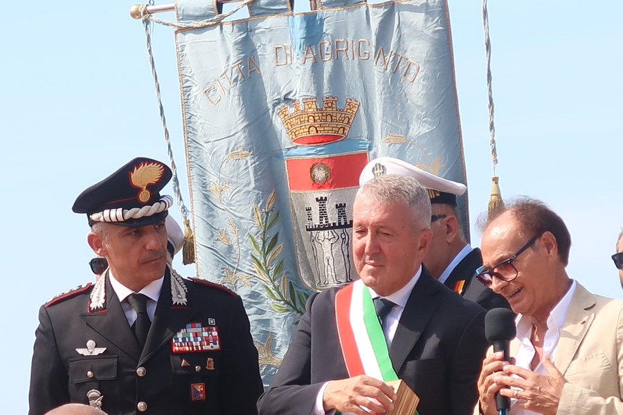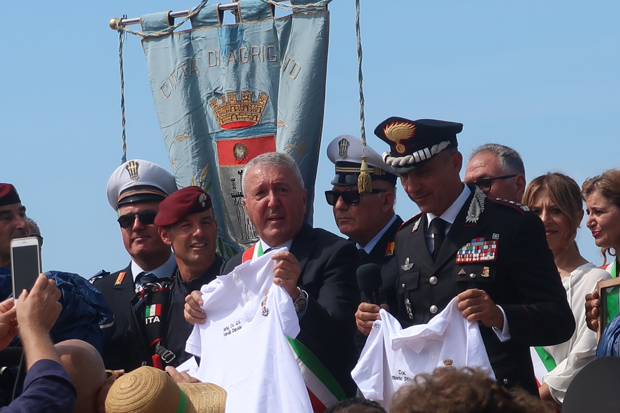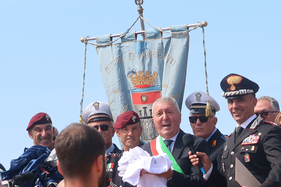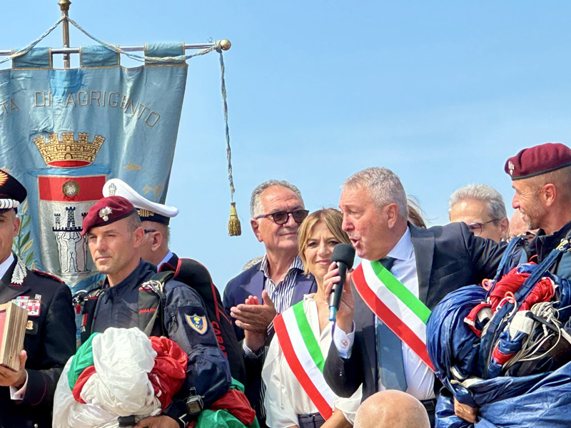 Il momento è stato introdotto dall’alza bandiera sulle note dell’inno nazionale. Poi tutti col naso all’insù, in attesa dell’elicottero da cui, a 1500 metri di altezza, si sono lanciati i paracadutisti dei Carabinieri che, in uno spettacolo mozzafiato, durante la discesa hanno fatto sventolare, nei cieli di Agrigento un tricolore di 150mq che, atterrando davanti il palco, hanno consegnato alla Città, nelle mani del al sindaco Francesco Miccichè perché possa essere esposto in occasione delle celebrazioni di Agrigento Capitale della Cultura Italiana 2025. Davanti il concordia, con una precisione straordinaria, sono atterranti anche gli altri due paracadutisti che durante la discesa hanno fatto sventolare la bandiera con l’emblema dei Carabinieri e del 1° Reggimento Tuscania, come segno di attenzione e servizio dell’Arma alla città e provincia di Agrigento dalla sua fondazione ad oggi. La cerimonia si è conclusa con la consegna al Colonnello Vittorio Stingo, da parte del sindaco, di una targa che così recita: “Al Comandante Provinciale dei Carabinieri, Col. Vittorio Stingo, cittadino onorario di Agrigento, per l’infaticabile impegno a supporto del contrato al crimine e per l’attestata dedizione volta allo sviluppo sociale e culturale del territorio”. A prendere la parola, a nome dei sindaci finalisti, il sindaco di Orvieto che ha ringraziato per