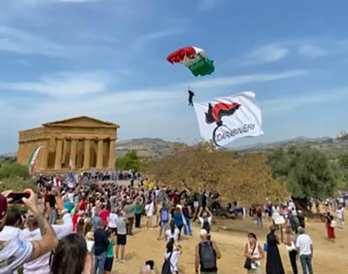 Questa mattina, 3 settembre 2023, nel cuore della Valle, davanti il tempio della Concordia, alla presenza di una rappresentanza dei sindaci della Provincia di Agrigento, di quelli delle città finaliste del bando per il conferimento del titolo di “Capitale italiana della Cultura 2025” e di un folto numero di cittadini e turisti, l’Arma dei Carabinieri, in collaborazione con l’amministrazione comunale e la Regione Siciliana hanno presentato il primo atterraggio del tricolore a cura del Primo Reggimento Carabinieri paracadutisti “Tuscania”. L’evento vuole essere il contributo dell’Arma al territorio – ha detto il comandante del Reggimento nel suo intervento – verso Agrigento “Capitale della cultura 2025”.
