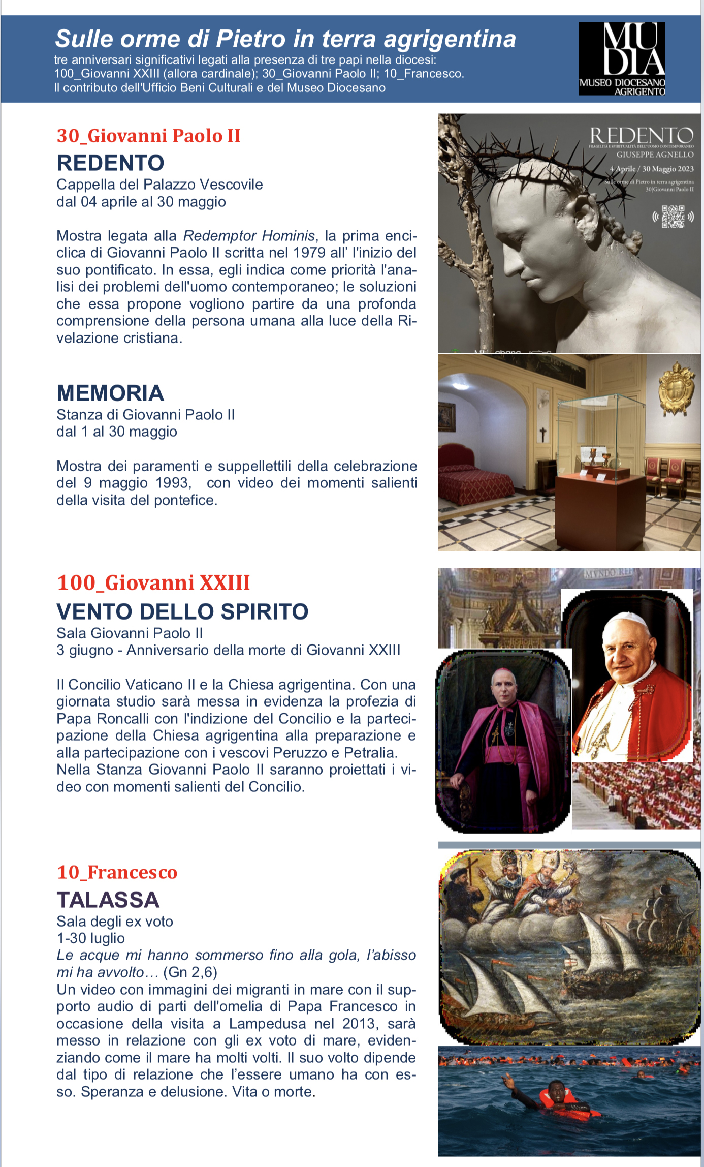 Il Museo Diocesano di Agrigento (MUDIA), in occasione dell’iniziativa “Sulle orme di Pietro in terra agrigentina” (vedi), propone, da maggio e luglio, per ciascuno degli degli anniversari papali, gli eventi:“Redento”, “Memoria”, “Vento dello Spirito” e “Talassa”