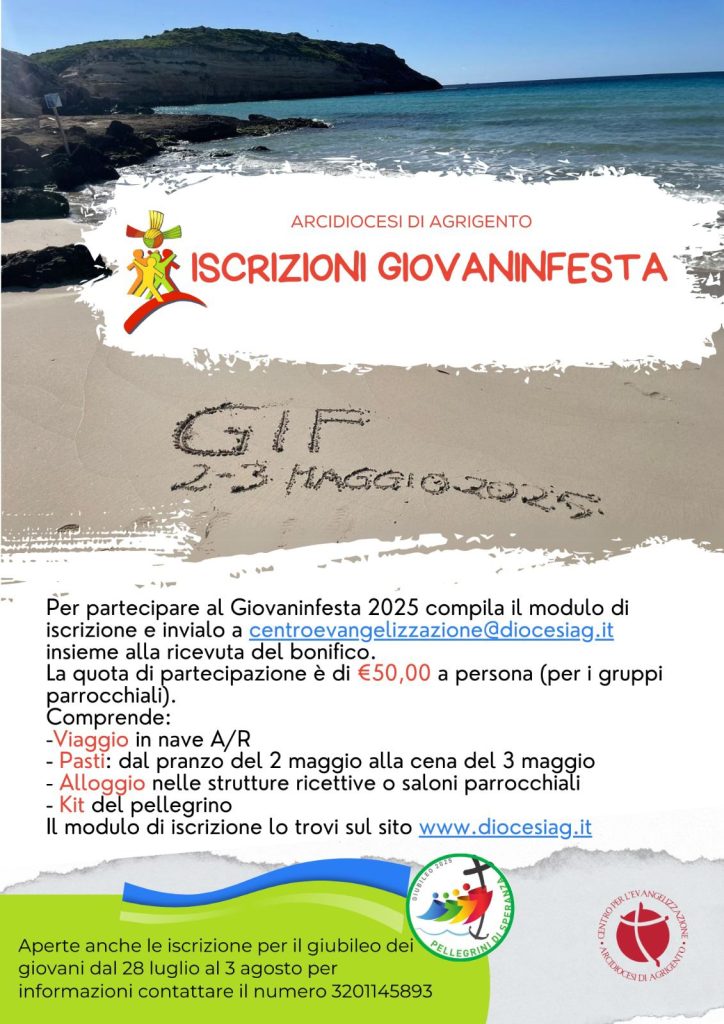 Banca INTESA SANPAOLO Intestato: ARCIDIOCESI DI AGRIGENTO Via Duomo, 96 92100 Agrigento IBAN: IT69Y0306909606100000006841 NELLA CAUSALE INDICARE IL NOME DEL GRUPPO E QUOTE ISCRIZIONE GIOVANINFESTA O GIUBILEO DEI GIOVANI