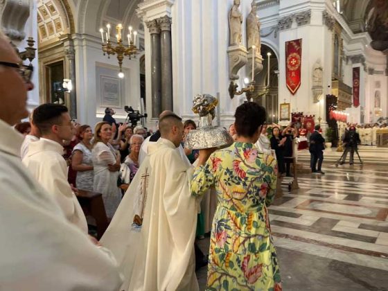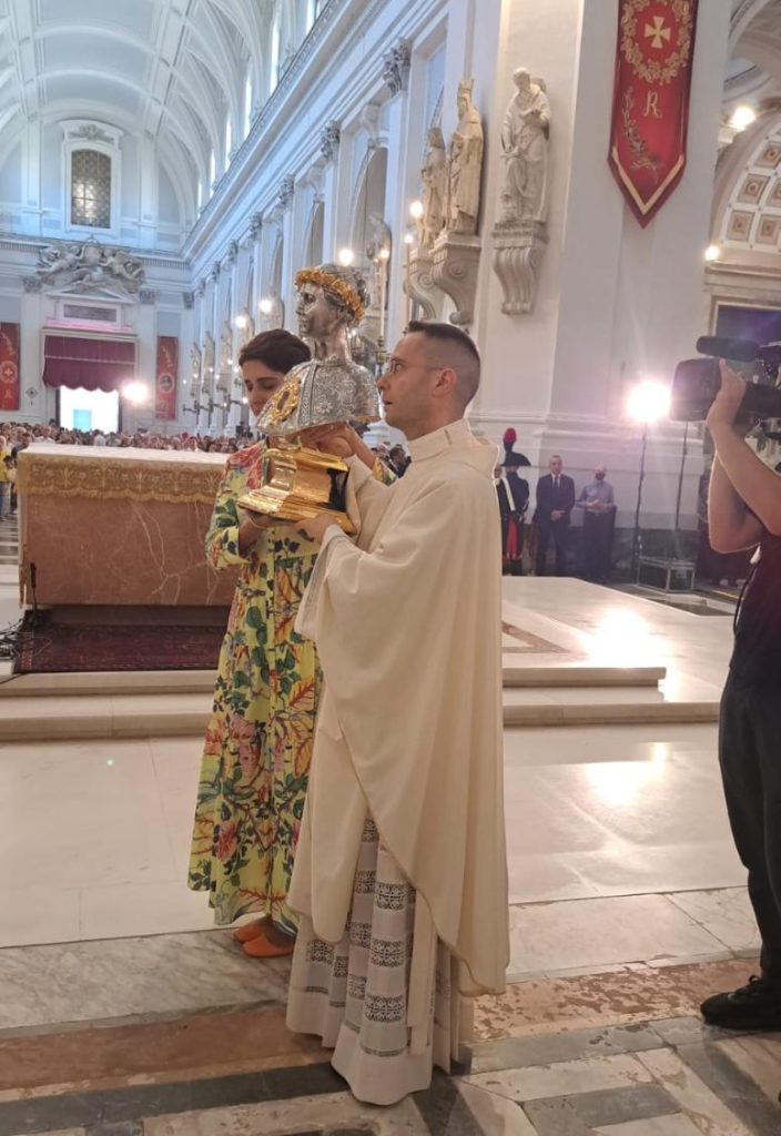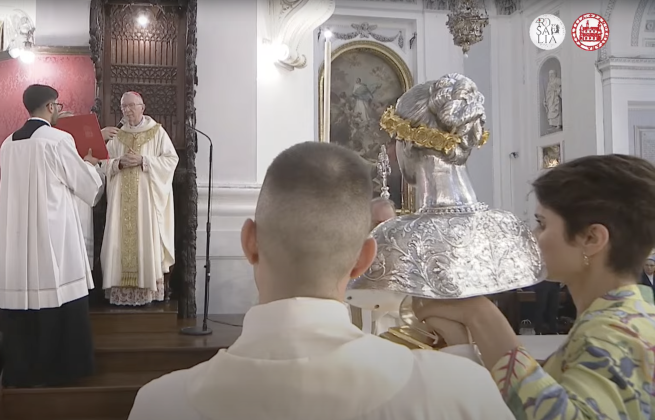 Lunedì 15 luglio nella Cattedrale di Palermo, durante la Messa Pontificale, nella Festa del ritrovamento delle reliquie della santa palermitana, presieduta dal cardinale Pietro Parolin, segretario di Stato della Santa Sede (qui), è stato benedetto il nuovo busto reliquiario di Santa Rosalia della Comunità di Bivona, contenente le reliquie della santa, donate dall’arcivescovo Corrado Lorefice. (guarda il video)