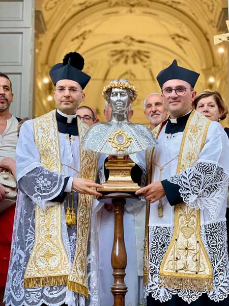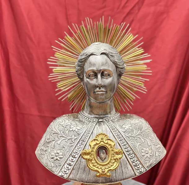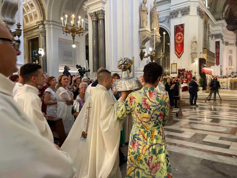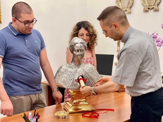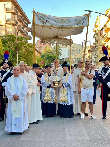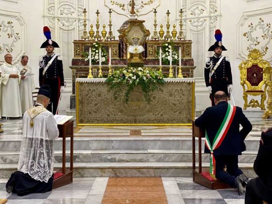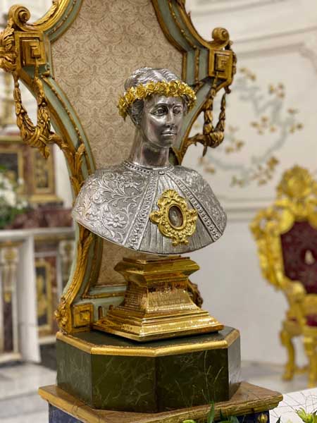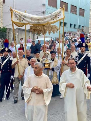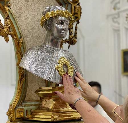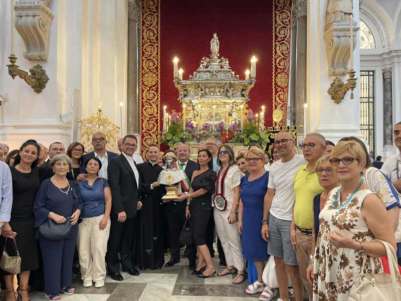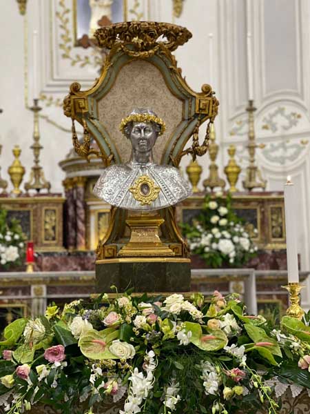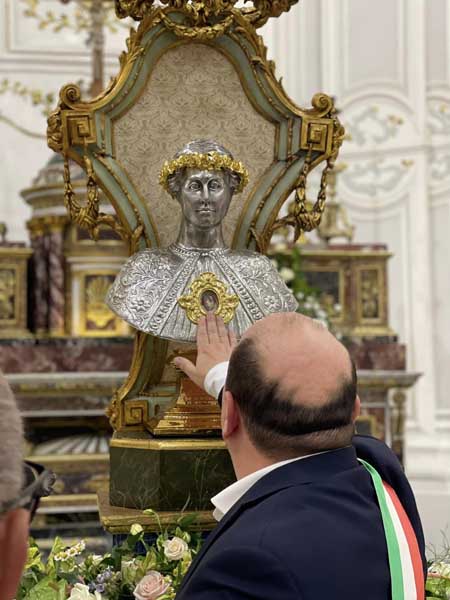 Il parroco e il sindaco, in ginocchio dinanzi il reliquiario, insieme a tutto il popolo presente, hanno recitato l’atto di affidamento alla santa patrona e, dopo la venerazione delle reliquie, il busto è stato intronizzato. Mercoledì 17 luglio si è tenuta la celebrazione eucaristica di ringraziamento alla presenza del venerabile busto.