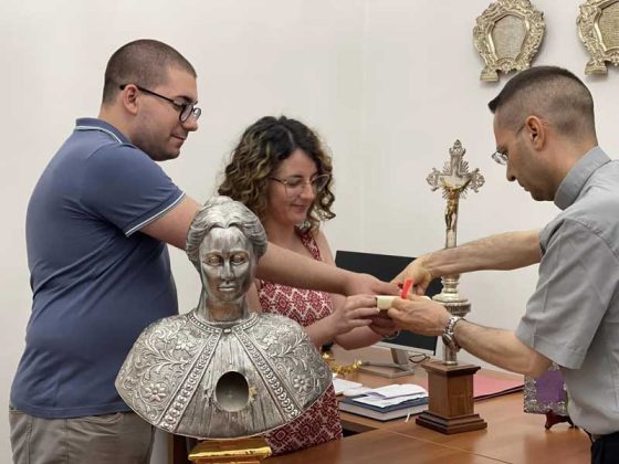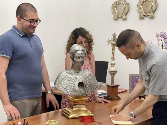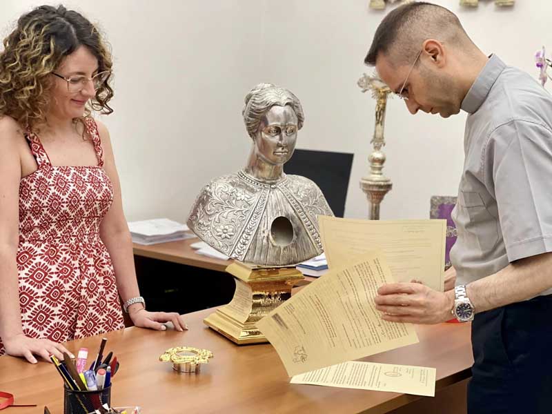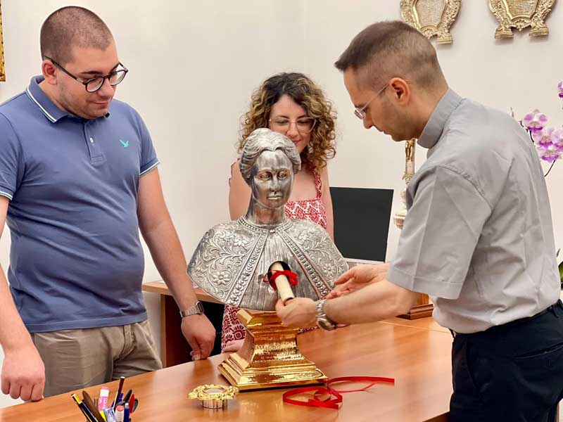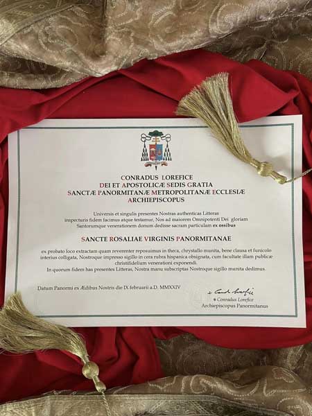 Il 18 luglio 2024, si è tenuto l’ultimo passaggio relativo all’accoglienza del busto reliquiario di Santa Rosalia. Alla presenza di due testimoni, sono stati collocati all’interno del Reliquiario: l’Atto di Autentica della Reliquia di Santa Rosalia firmato da S. E. Rev.ma Mons. Corrado Lorefice (qui), Arcivescovo Metropolita di Palermo insieme alla Lettera richiesta Reliquia, Benedizione Busto e Invito a Sua Eccellenza a presiedere S. Messa il prossimo 4 Settembre.
