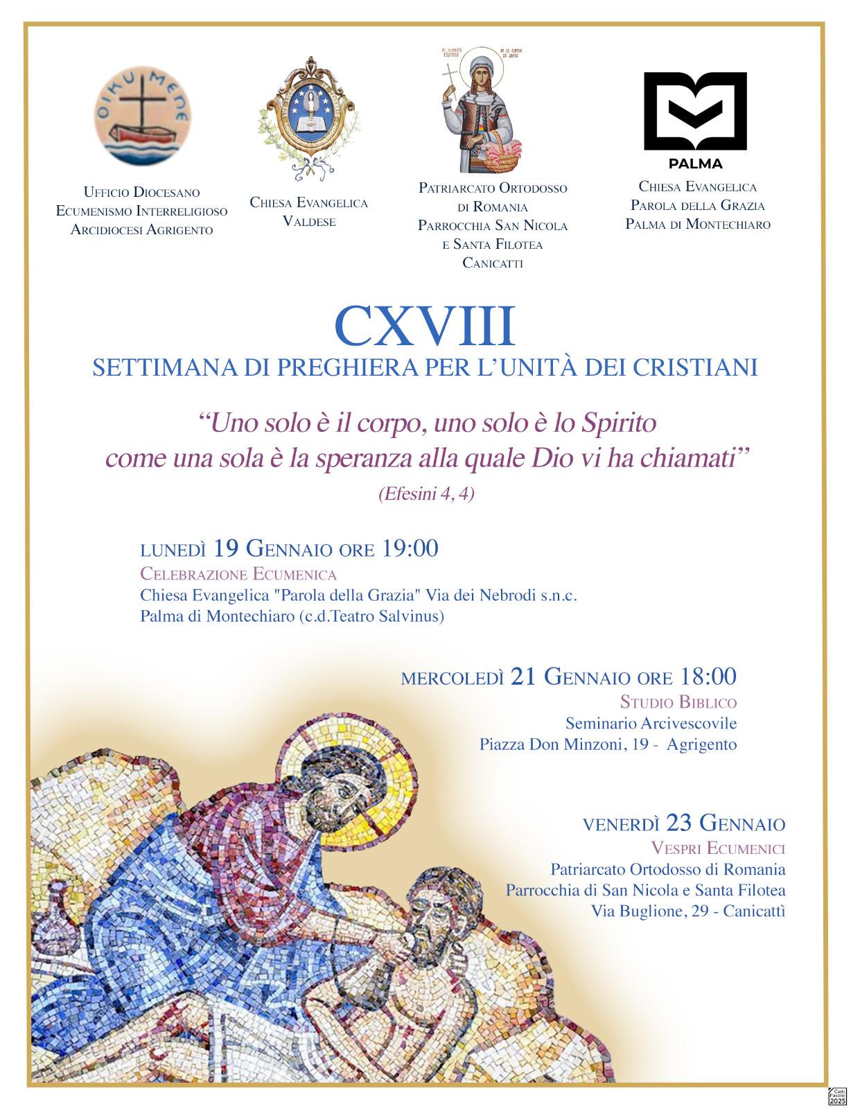 Dal 18 al 25 gennaio 2026 l’Arcidiocesi di Agrigento ha celebrato la 118ª Settimana di Preghiera per l’Unità dei Cristiani. Il tema di questa edizione è stato tratto dalla lettera agli Efesini: “Uno solo è il corpo, uno solo è lo Spirito come una sola è la speranza alla quale Dio vi ha chiamati” (4,4). Il calendario degli eventi nell’Arcidiocesi di Agrigento è stato strutturato per toccare diverse realtà locali, favorendo l’incontro diretto tra i fedeli di differenti tradizioni e testimoniando come il superamento dei pregiudizi sia stato possibile attraverso la condivisione di spazi e liturgie.