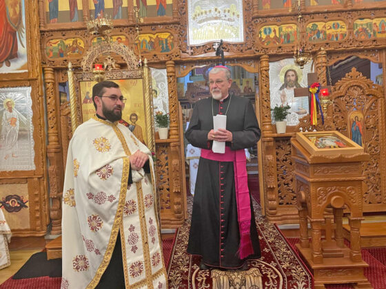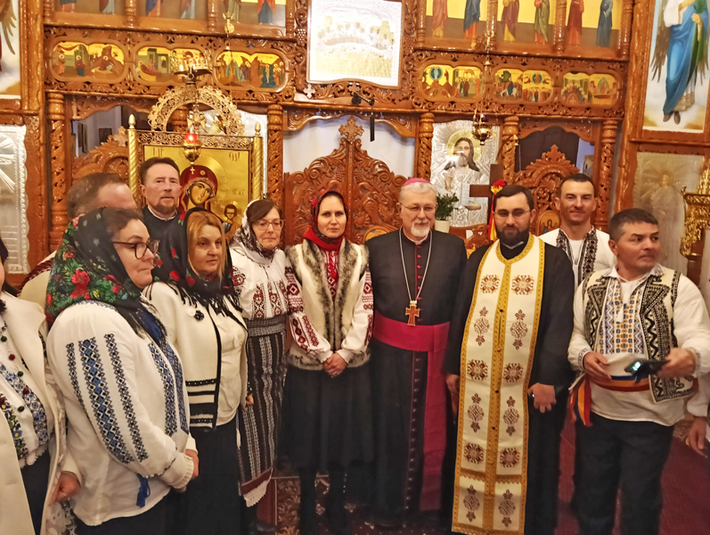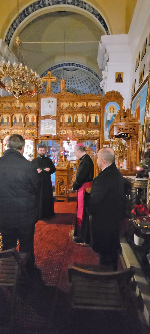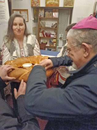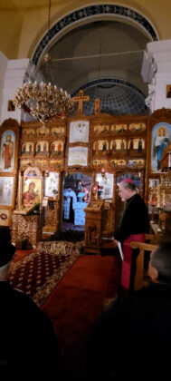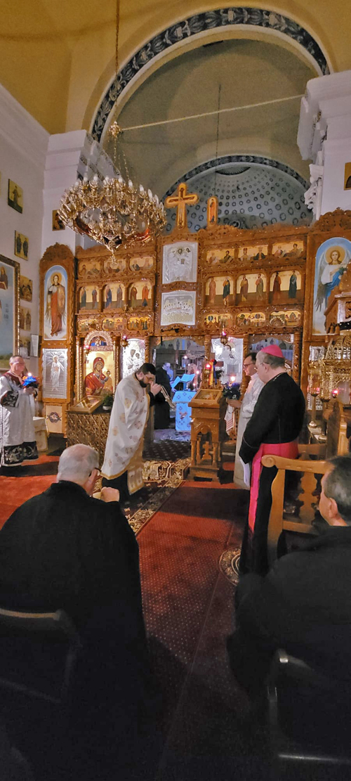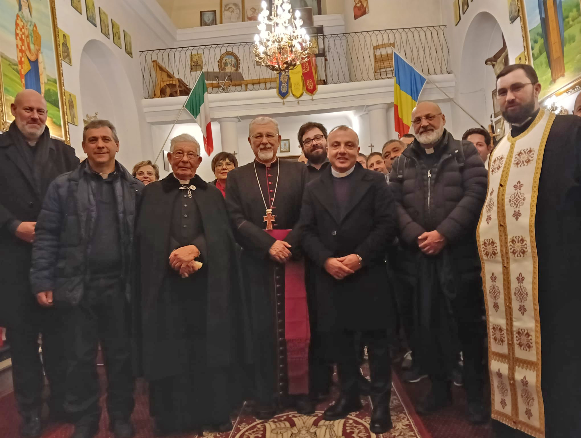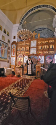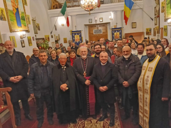 Al suo arrivo, l’Arcivescovo è stato ricevuto dal parroco, Padre Ciprian Gavrilescu, mentre alcuni fedeli in abiti tradizionali gli hanno offerto il tradizionale “pane e sale”, tipico segno di benvenuto del mondo slavo. L’assemblea si è poi immersa in un ambiente di profonda spiritualità, all’interno di una chiesa arricchita nel tempo da una preziosa iconostasi in legno e argento e da innumerevoli icone. Tra queste, ha assunto un significato particolare l’icona della Madonna di Pochaev, santuario ucraino, che ha sottolineato come la parrocchia sia un porto sicuro non solo per i romeni ma anche per la comunità ucraina. Accanto alla devozione per San Nicola, i fedeli hanno potuto venerare le insigne reliquie di Santa Filotea di Arges, condotte dalla Romania e custodite in un prezioso sarcofago ligneo istoriato. I Vespri sono proseguiti come di consueto sotto la presidenza di Padre Ciprian e, al termine della liturgia, sia l’Arcivescovo Alessandro che il Pastore Giovanni Bernardini della Chiesa Valdese hanno rivolto una riflessione ai presenti.
