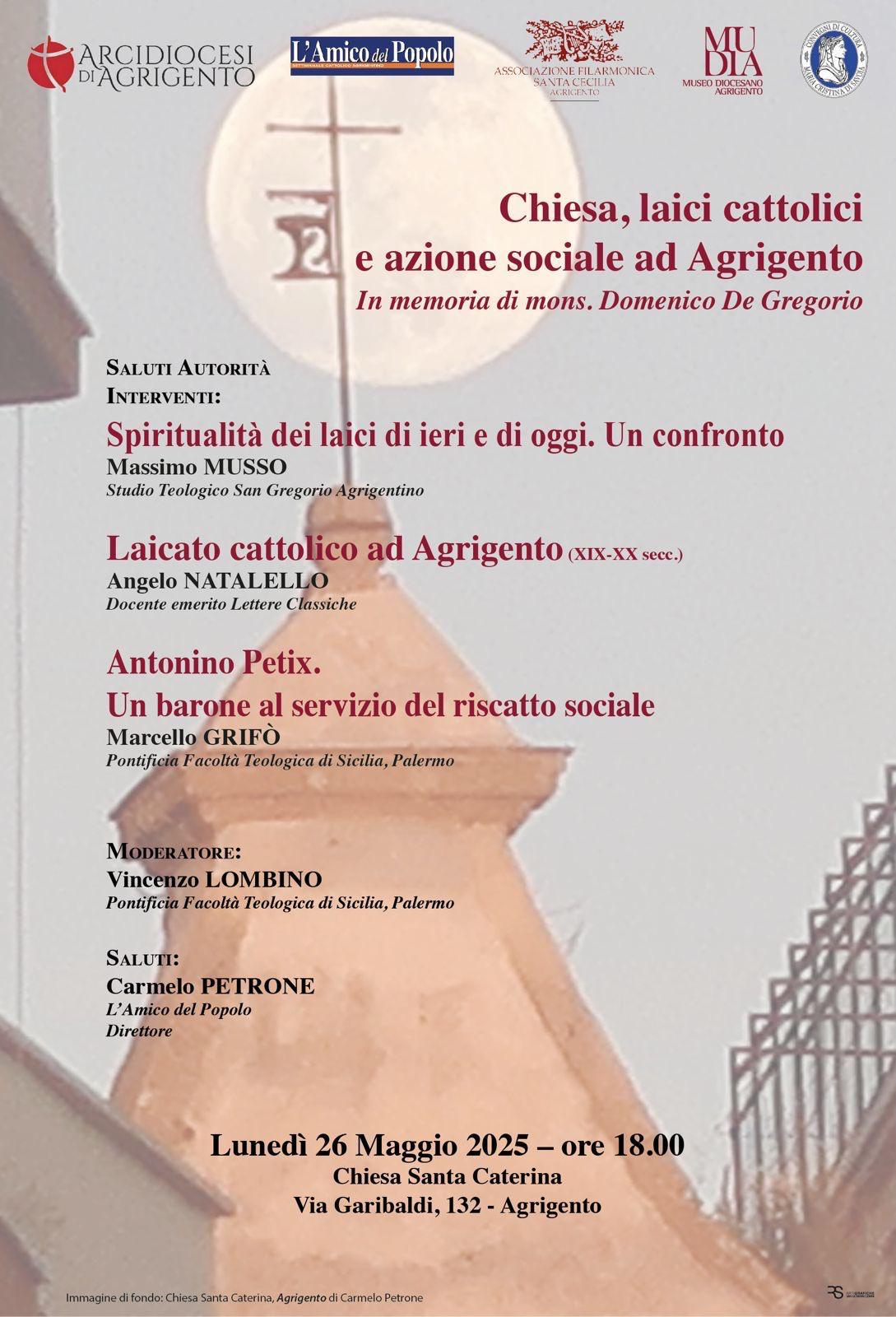 “Chiesa, laici cattolici e azione sociale ad Agrigento – In memoria di mons. Domenico De Gregorio” è il tema del convegno che si è tenuto, lunedì 26 maggio 2025, giorno anniversario della morte, nella chiesa santa Caterina di Agrigento per ricordare il sacerdote, l il letterato, il giornalista e lo storico, della chiesa Agrigentina, per 25 anni anni direttore del nostro settimanale.