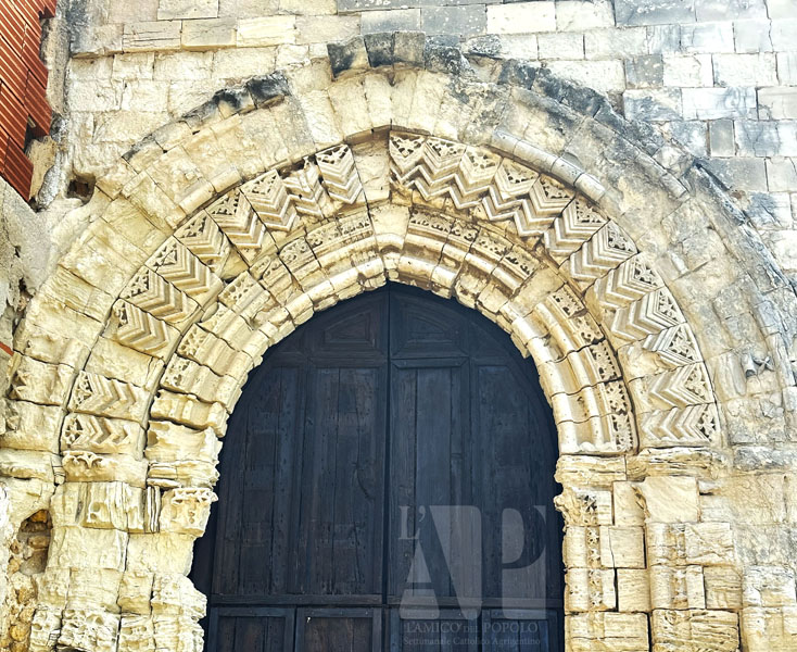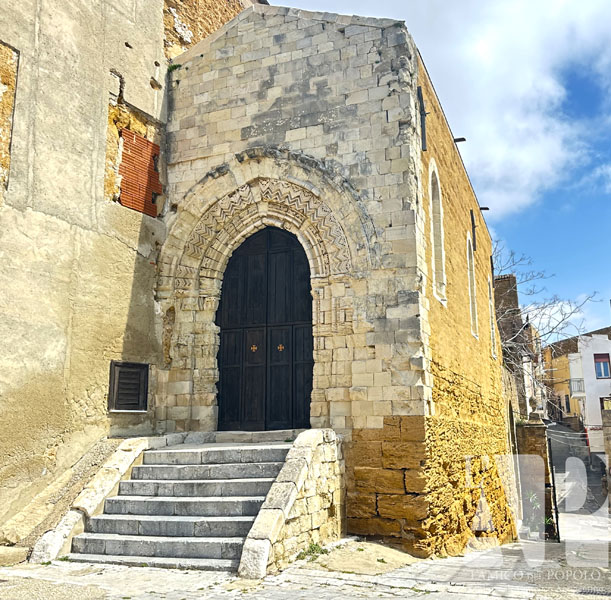 Tale portale, realizzato da biocalcarenite gessosa, è costituito da una pregevole soluzione di conci a barre ed esili colonne cilindriche sormontati da capitelli corinzi, con una ricchezza d’intaglio tipica dell’arte chiramontana. Le tre ghiere che racchiudono l’arco a sesto acuto presentano dedecorazioni differenti: la prima contiene motivi floreali; la seconda presenta motivi a linee spezzate, a zig-zag; la terza, ormai completamente disgregata, conteneva una fila di stelle a quattro punte. Il resto del prospetto è caratterizzato dall’uso di una pietra diversa, utilizzata da Valenti nel restauro del 1920. Trattasi probabilmente della pietra di Comiso, molto simile alla biocalcarenite gessosa ma più consistente”. (cfr.agrigentodoc.it)