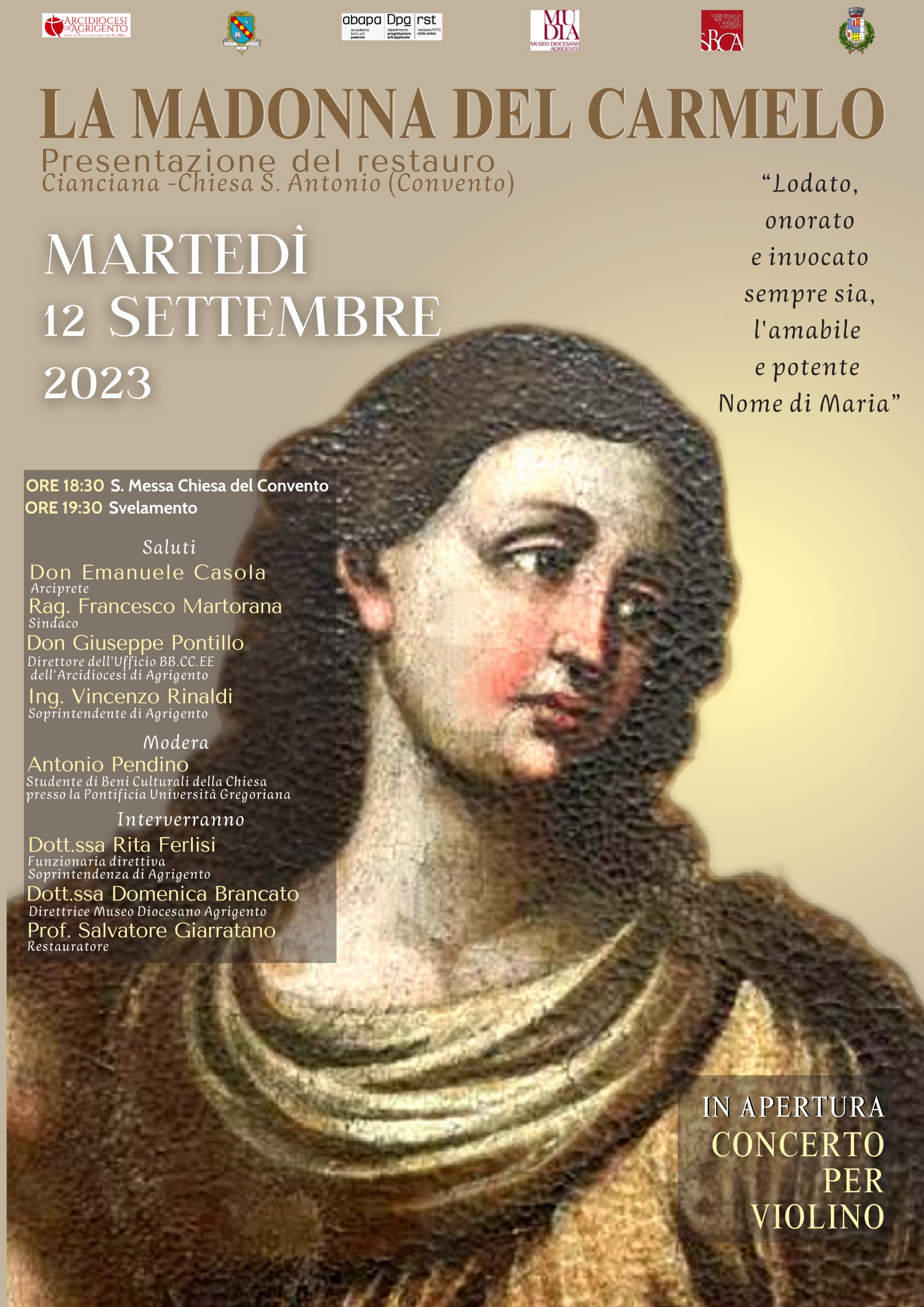Daranno i saluti padre Emanuele Casola, Arciprete di Cianciana, Francesco Martorana , Sindaco di Cianciana, padre Giuseppe Pontillo, Direttore dell’Ufficio Beni Culturali dell’Arcidiocesi e il Soprintendente di Agrigento Vincenzo Rinaldi. Interverranno Rita Ferlisi, Storico dell’Arte della Soprintendenza, Domenica Brancato Storico dell’arte dell’Arcidiocesi, Salvatore Giarratano, Restauratore; modererà Antonio Pendino Studente della Pontificia Università Gregoriana.