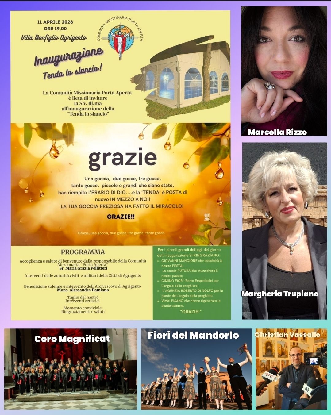 La cerimonia di sabato si preannuncia come una vera festa di popolo e di fede. Dopo l’accoglienza di Suor Maria Grazia e i saluti delle autorità civili e militari, il momento centrale sarà la benedizione solenne di Mons. Alessandro Damiano, Arcivescovo di Agrigento, che sin dai primi momenti dopo il rogo aveva espresso vicinanza alla Comunità (leggi qui). La serata sarà arricchita da contributi artistici e testimonianze. Un momento conviviale, sostenuto da diverse realtà produttive locali concluderà l’evento. La rinascita della Tenda non rappresenta soltanto il ripristino di una struttura, ma la risposta di una comunità che non si lascia intimidire dalla violenza: è la vittoria dell’impegno sociale ed ecclesiale sul degrado, un segnale di resilienza che restituisce dignità e coesione all’intera città.