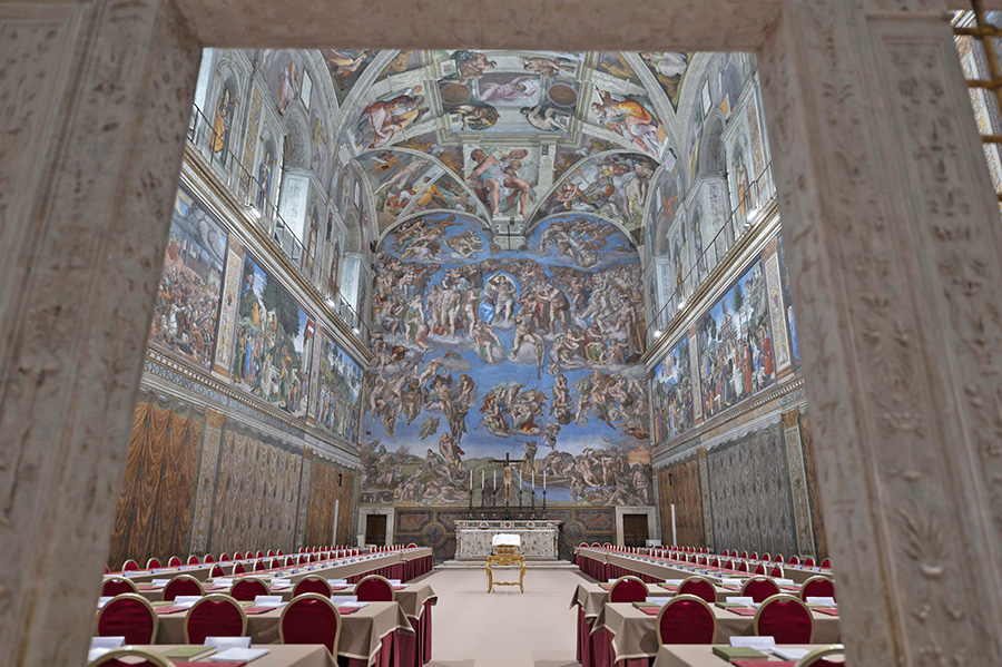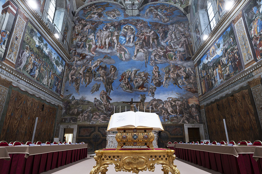 Quel fuoco che, prima che divampare nella stufa, preghiamo accenda il cuore dei fedeli cardinali, lo Spirito che Cristo ha promesso ai suoi amici, anche alla Sistina. Ai piedi dell’affresco del Cristo raffigurato da Michelangelo nell’atto di dare inizio al vortice della sentenza universale, alla destra del giudice in basso i corpi che risuscitano per la vita. Alla sua sinistra, sempre in basso, altri sono cacciati verso un antro dove, in fondo, l’artista raffigura un altro tipo di fuoco che brucia. Tenendo la scheda sollevata in modo che sia visibile, dal loro posto, singolarmente, i porporati si recheranno sotto il Giudizio universale, all’altare posto tra il rimando allo Spirito che da vita alle ossa inaridite narrate da Ezechiele e la condanna del fuoco inestinguibile, e pronunceranno questa frase: “Chiamo a testimone Cristo Signore, il quale mi giudicherà, che il mio voto è dato a colui che, secondo Dio, ritengo debba essere eletto”.