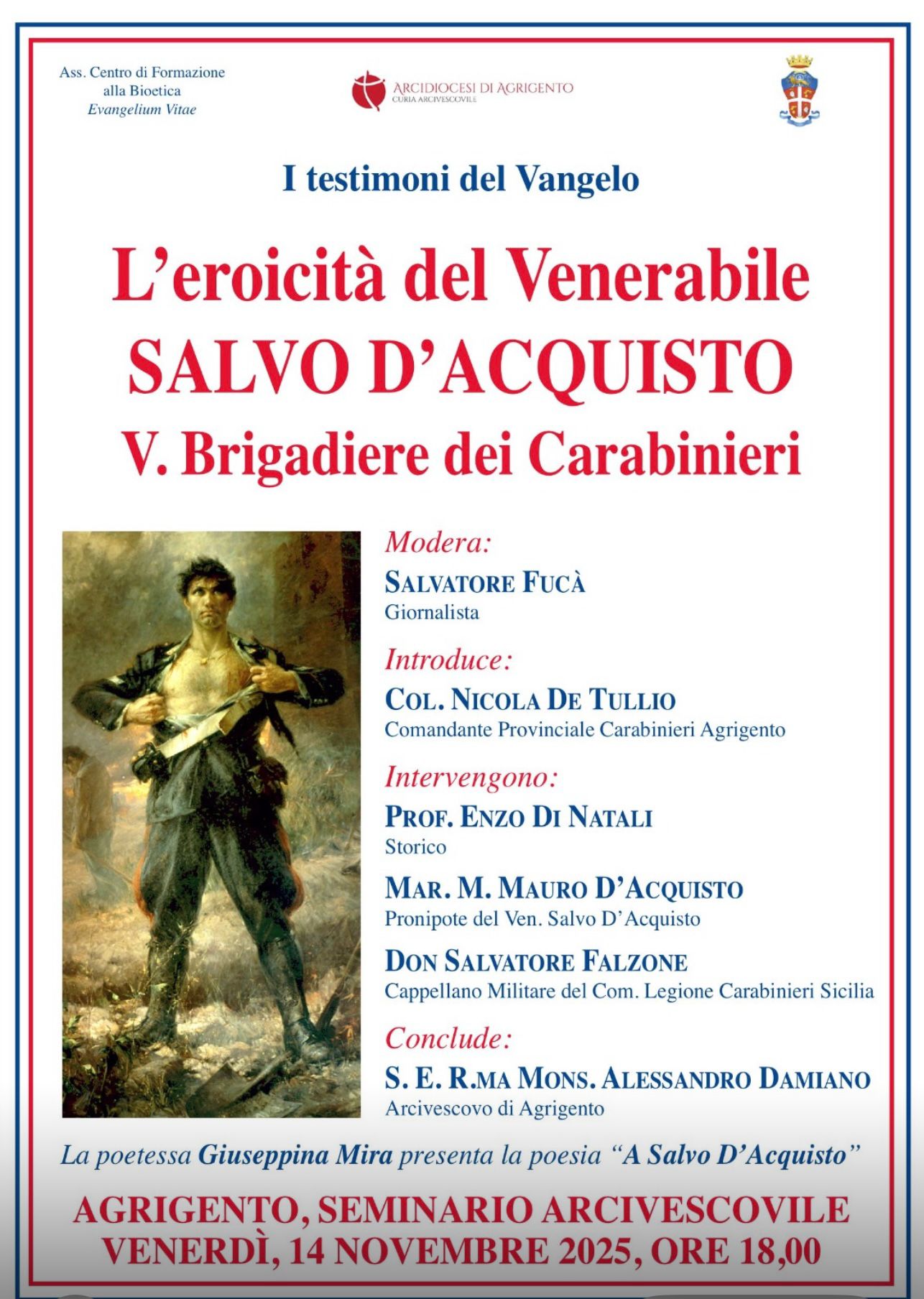 Si terrà venerdì 14 novembre 2025 alle 18 al Seminario Arcivescovile di Agrigento un convegno sui Testimoni del Vangelo dal tema “L’eroicità del venerabile Salvo D’Acquisto, vicebrigadiere dei Carabinieri”.