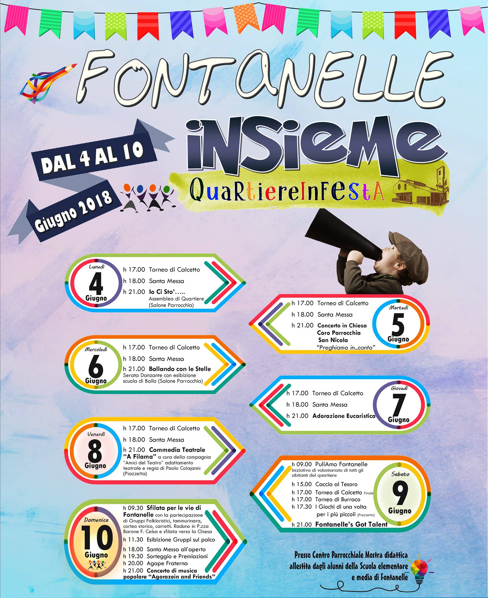 Sabato 9 giugno si comincia alla ore 9.00 con “PuliAmo Fontanelle”, iniziativa di volontariato di tutti gli abitanti del quartiere; si prosegue alle ore 15.00 con la “Caccia al tesoro” (per iscrizioni chiamare Alessandra 3286257563 o Marco 3935655716). Alle 17.00 sarà disputata la finale del Torneo di calcetto e si terrà il torneo di burraco (per iscrizioni 3385291331) ed alle ore 17.30, nella piazzetta, “I giochi di una volta per i più piccoli”. Alle ore 21.00 “Fontanelle’s got talent”, alla scoperta dei talenti del quartiere.