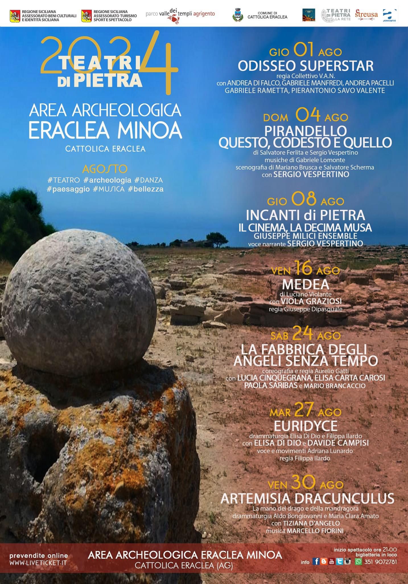Ad Eraclea Minoa nell’area archeologica di Cattolica Eraclea I Teatri di Pietra inizieranno giovedì 1 agosto con “Odisseo Superstar”. TTR Il Teatro di Tato Russo e V.A.N. Verso Altre Narrazioni, ricominciano la loro indagine sul mito di Omero seguendo la vita di Ulisse. L’eroe omerico diventerà il punto di vista privilegiato per raccontare, in modo ironico, scanzonato e poetico diverse storie della mitologia che lo vedono protagonista. La storia di Ulisse, fino a diventare Odisseo, dopo il suo grande viaggio, verrà raccontata da dei Musi. Ogni suo gesto lo porterà ineluttabilmente a diventare chi è, in un meccanismo comico incalzante accompagnato dai personaggi più bizzarri della mitologia. Con Andrea Di Falco, Gabriele Manfredi, Andrea Pacelli, Gabriele Rametta, Pierantonio Savo Valente.