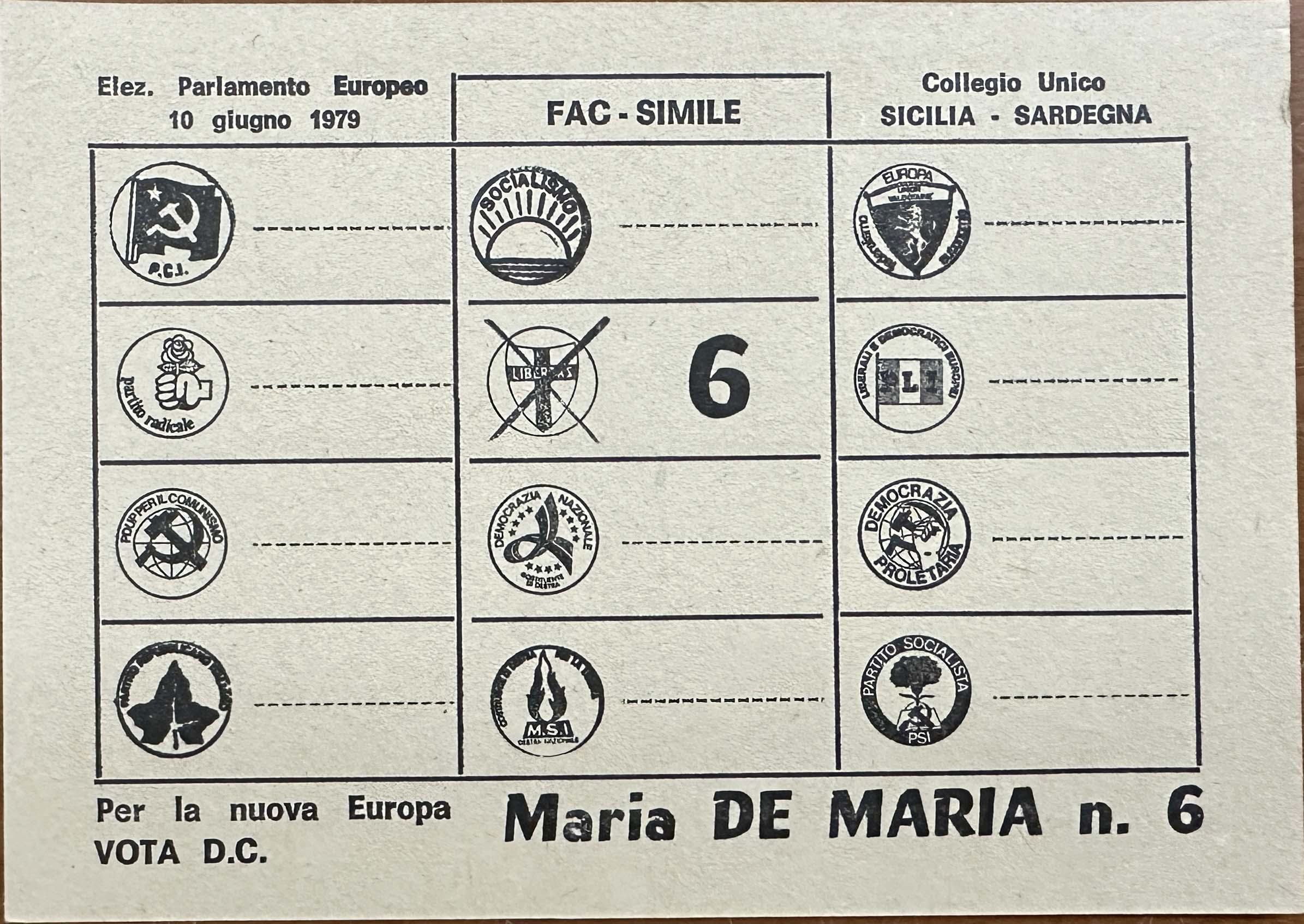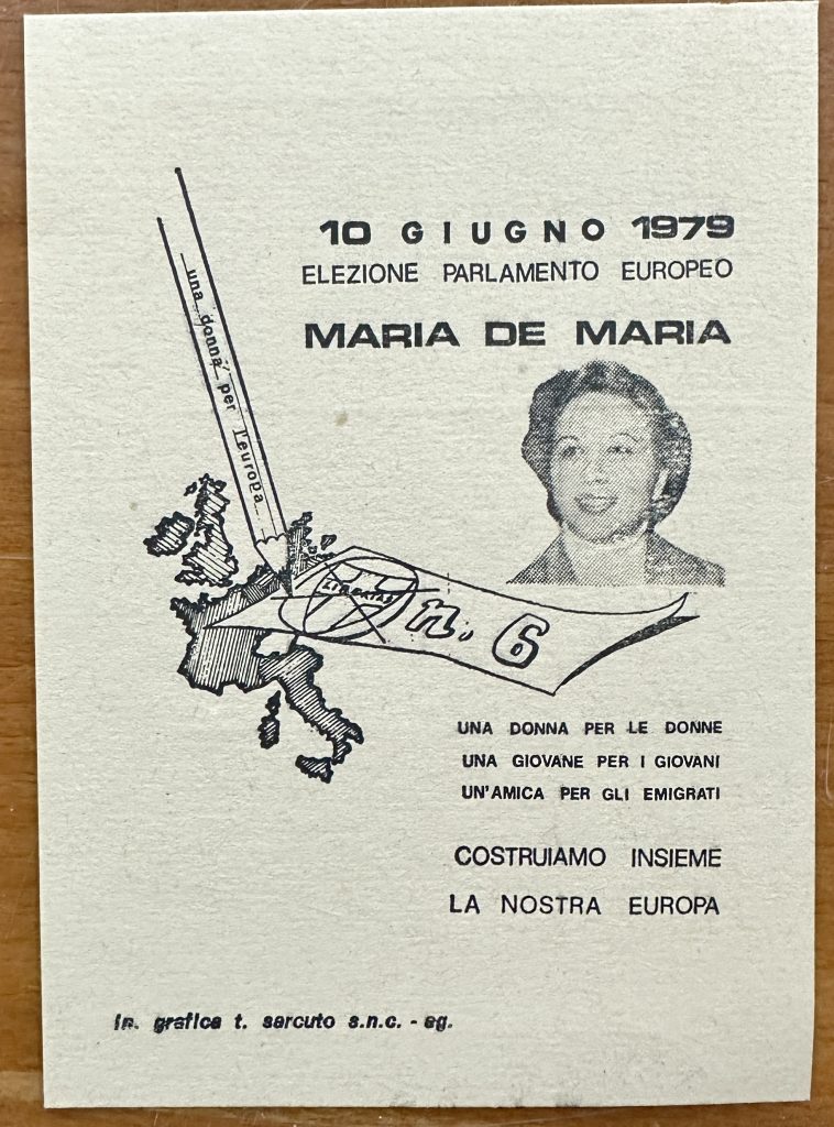 Maria De Maria era impegnata in seno all’Azione Cattolica, nel CIF, come membro del Consiglio Provinciale, componente della Presidenza delle ACLI e membro del Consiglio Provinciale della Democrazia Cristiana; racconta come apprese della scelta che giunse direttamente da parte del segretario nazionale della DC, Benigno Zaccagnini. «I “big” territoriali della DC – dice De Maria – rimasero sorpresi della scelta e, pur accentandola per non dispiacere il segretario nazionale non la sostennero». Racconta, inoltre, del poco impegno profuso dal partito e dai leader, per la sensibilizzazione l’elettorato sull’importanza storica del voto europeo impegnati com’erano per le elezioni parlamentari nazionali che si tennero la settimana prima. Nonostante il mancato sostegno De Maria, che sapeva in partenza che non poteva essere eletta, ottenne un ottimo risultato anche in Sardegna e tra i nostri connazionali all’estero. Per quanto la riguarda, confessa, è stata un’esperienza esaltante e formativa che ha segnato la sua vita. Infine lancia un accorato appello a non disertare le urne per continuare insieme la costruzione della casa comune europea unita, plurale e custode della pace.