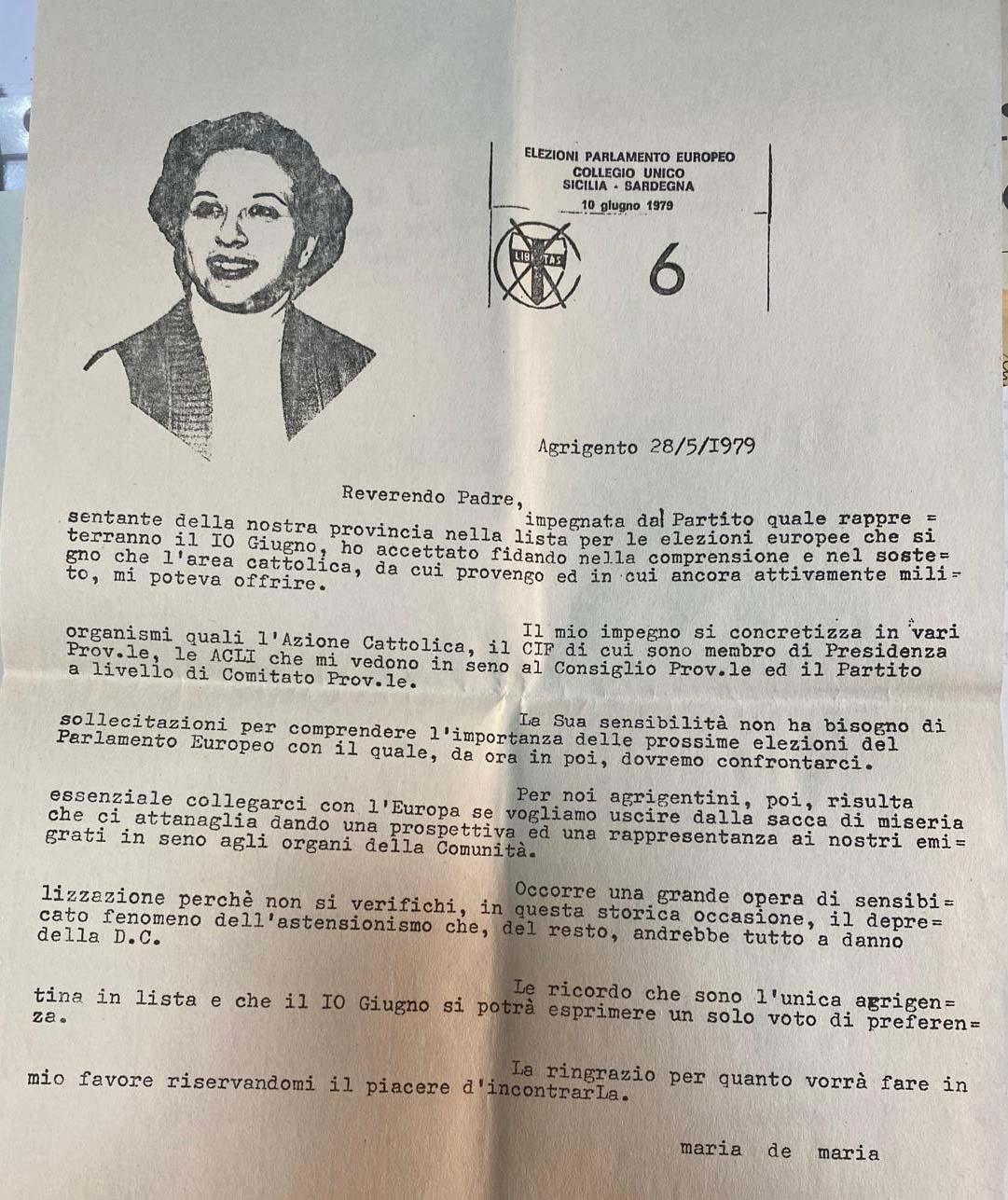 N.B. La Signora De Maria, ha consegnato il materiale relativo alle elezioni del 1979 al “fondo “Democrazia Cristiana” costituito presso l’Archivio Diocesano della Curia Arcivescovile di Agrigento. Pubblichiamo qui, a titolo esemplificativo la lettera ai preti, quella agli acuisti ed i fac-simili elettorali, la cui grafica, ci ha detto la De Maria è stata realizzata dallo scultore e pittore agrigentino, Pino Cirami.