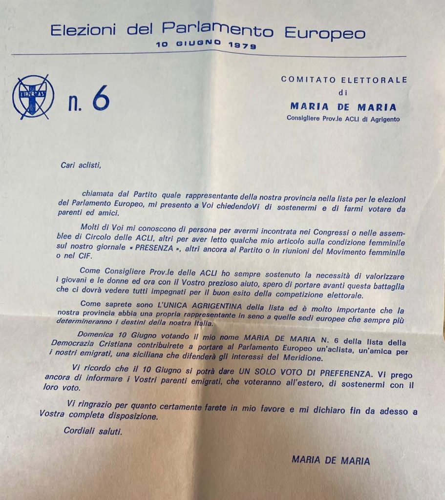 A pochi giorni dalle elezioni europee dell’8 e 9 giugno 2024, abbiamo incontrato la signora Maria De Maria, prima e unica donna agrigentina candidata alle prime elezioni dirette del Parlamento Europeo svoltesi il 10 giugno 1979 per il collegio unico Sicilia-Sardegna.