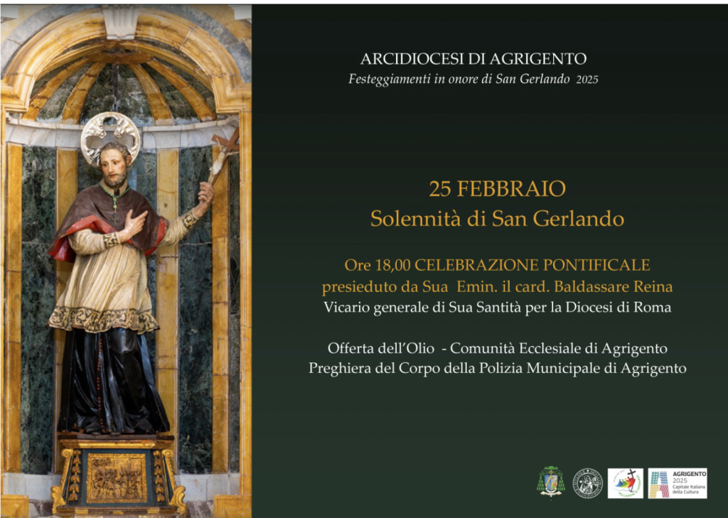 Celebrare il Patrono di una città significa asserire solennemente che egli, oltre che nella fede, è pure il Pater civitatis, il fondatore della Città stessa. La Città non è un ammasso d’individui ma una comunità perché i cittadini hanno una comunanza di fini e la comunanza di fini richiede un fondamento indisponibile che solo Dio può garantire. I vescovi patroni hanno difeso le loro città da nemici e carestie; talvolta, le hanno tenute insieme nelle difficoltà e, talvolta, perfino governate. La festa del Patrono ricorda che le questioni di quaggiù non si risolvono senza l’aiuto da lassù. Non si dissodano i terreni incolti se prima non si dissodano le anime. Le relazioni tra gli uomini rimangono conflittuali se prima non si sistemano le relazioni con Dio. La famiglia non può essere protetta con leggi e politiche se si dimentica la Santa Famiglia. Chi non guarda in verticale finisce per non guardare nemmeno in orizzontale. In questo anno le celebrazioni rientrano nel contesto del Giubileo e di Agrigento Capitale della cultura 2025 e sono connotate dal riaffermare, sulla scia della tradizione cristiana, la fede facendo parte del vissuto quotidiano genera stili di vita, comportamenti, arte, storia. Di Seguito il programma dettagliato: