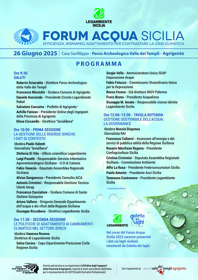Domani, giovedì 26 giugno, dalle 9:30 alle 13:30, presso Casa Sanfilippo, sede del Parco Archeologico della Valle dei Templi di Agrigento, si terrà il Forum Acqua Sicilia, promosso da Legambiente Sicilia con il patrocinio e la co-organizzazione dell’Ordine degli Ingegneri della Provincia di Agrigento e il patrocinio del Parco Valle dei Templi.