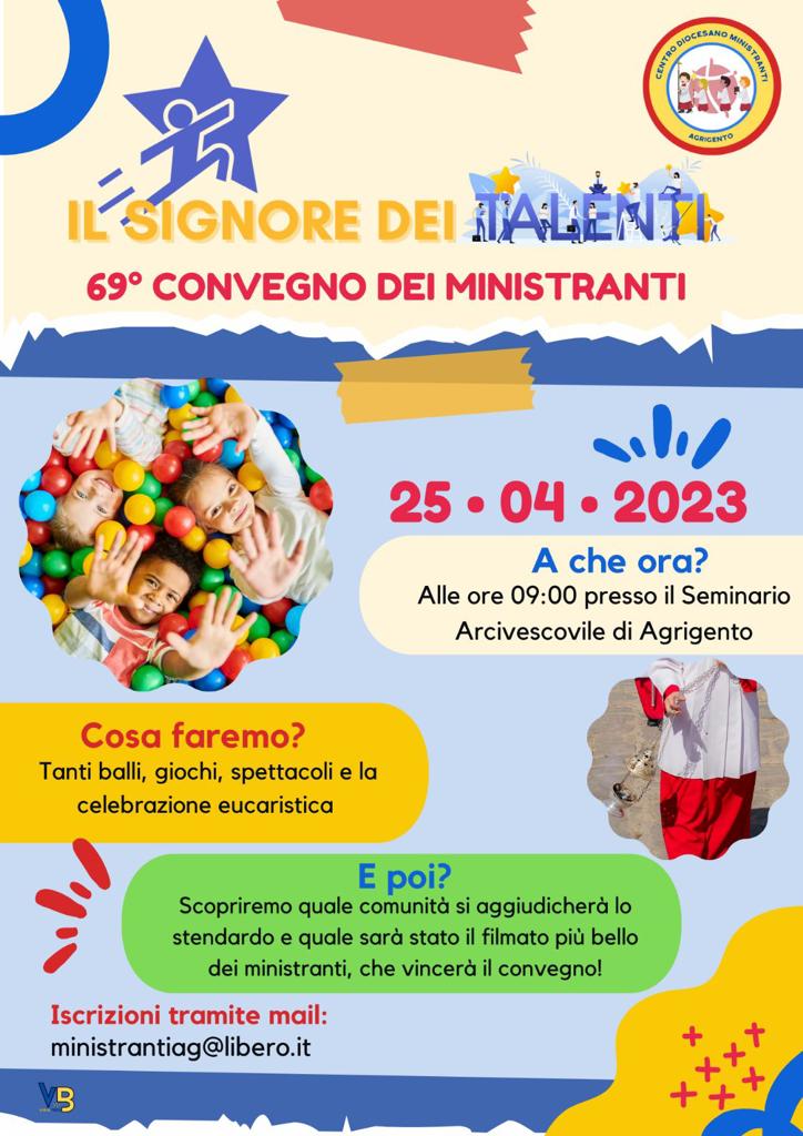 Il Convegno è il momento culminante del cammino, di formazione crescita umana e spirituale, proposto ai ragazzi, durante l’anno pastorale, dal Centro diocesano Ministranti in collaborazione con i presbiteri e gli animatori parrocchiali. Il tema che ha guidato il percorso per l’anno 2023 è stato: “Il Signore dei talenti”. Il Convegno, inoltre, è occasione, oltre che di festa e di incontro tra i diversi gruppi parrocchiali dell’Arcidiocesi di Agrigento, per fare sintesi del cammino fatto durante l’anno attraverso la preghiera, il gioco e lo stare insieme.