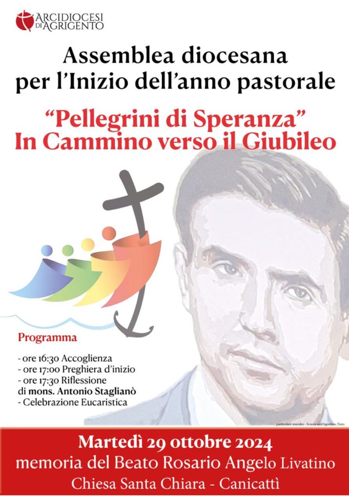 “Ci ritroveremo – scrive don Giuseppe – nella chiesa Santa Chiara di Canicatti alle ore 16.30. Dopo un momento di preghiera ascolteremo la riflessione che proporrà S.E. Rev.ma mons. Antonio Stagliano, presidente della Pontificia Accademia di Teologia, e concluderemo con la Celebrazione Eucaristica. Desideriamo iniziare – prosegue – il nuovo anno liturgico e pastorale riflettendo sul tema dell’ormai prossimo Giubileo, Pellegrini di Speranza, e lasciandoci stimolare dalla santità del nostro Magistrato martire che — nella sua esperienza di vita cristiana – ha saputo testimoniare in modo credibile e attraente la fede e l’amore che portava nel cuore ed è diventato seme fecondo di speranza.