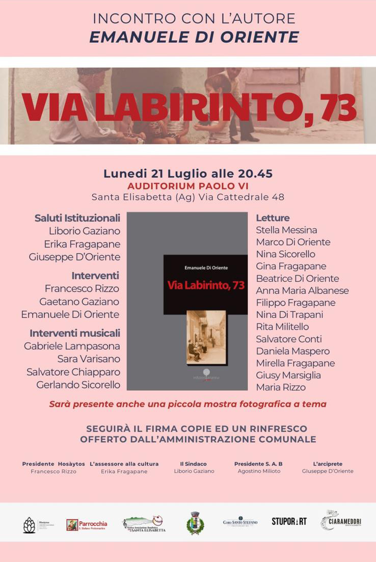 Lunedì 21 Luglio, alle ore 20.45 nell’Auditorium Paolo VI (Via Cattedrale 48) a Santa Elisabetta si presenta il testo “Via Labirinto, 73” di Emanuele Di Oriente. Sarà occasione propizia per immergersi nelle profondità della narrazione di Di Oriente, esplorando le tematiche care all’autore e il percorso che lo ha condotto alla scrittura di questa sua ultima opera.