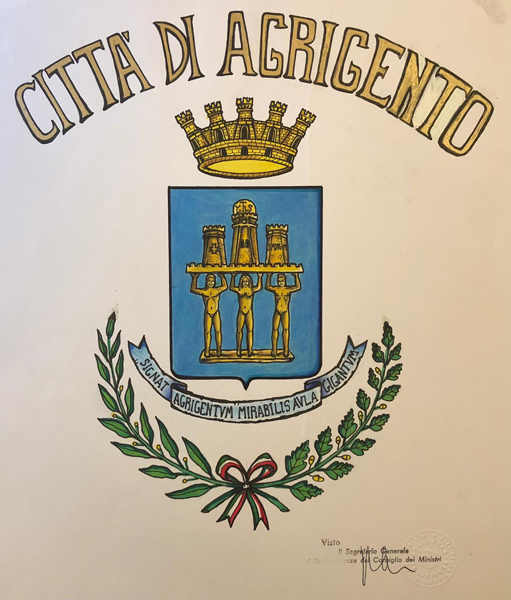 Si legge, infatti, nello Statuto: «Emblema raffigurativo del Comune è lo stemma costituito da tre giganti che sostengono tre torri contraddistinto dal motto “Signat Agrigentum mirabilis aula gigantum”, così come riportato nella scultura del XV secolo custodita nel museo civico». A realizzarlo è stato l’artista agrigentino Sergio Criminisi, che vi ha lavorato quasi tre anni, con la diretta collaborazione di Luigi Ruoppolo e Domenico Sinaguglia e gli uffici preposti.