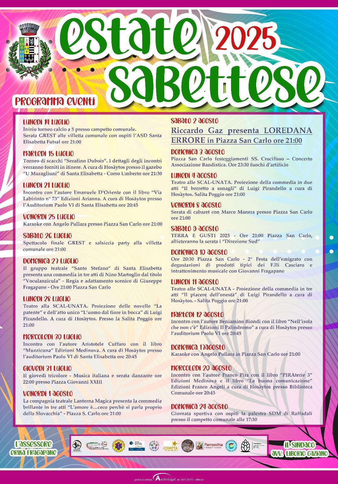 Per maggiori dettagli su orari e possibili variazioni, si consiglia di consultare le pagine social delle varie associazioni, il sito del Comune di Santa Elisabetta o i manifesti locali. Un’opportunità per vivere un’estate all’insegna della cultura, dell’incontro e della partecipazione, valori che sono alla base di una società più giusta e solidale.