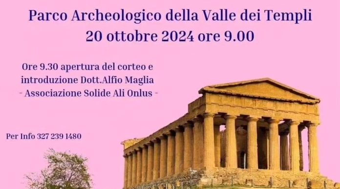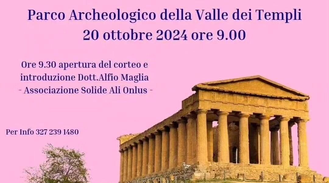 L’associazione Solide Ali Onlus di Cammarata e San Giovanni Gemini ha organizzato per domenica 20 ottobre alle ore 9 al Parco Archeologico della Valle dei templi, l’evento “La Valle in rosa”. La partenza è fissata dal tempio di Giunone e dopo una prima sosta al Tempio della Concordia ne è prevista un’altra al tempio di Ercole. Interverranno Francesco Miccichè, Sindaco di Agrigento, Giuseppe Capodieci – Direttore Generale Asp Agrigento, Roberto Sciarratta – Direttore del Parco Archeologico Valle dei Templi. Inoltre, Santo Pitruzzella, Presidente Ordine dei Medici della Provincia di Agrigento, Antonino Savarino – Direttore F.F. U.O.C. Ospedale “San Giovanni di Dio” di Agrigento e Coordinatore Centro di Senologia ASP AG, Michele Bono – Direttore U.O.C Radioterapia Ospedale San Giovanni di Dio di Agrigento, Riccardo Mandracchia- Direttore F.F. U.O.C. Radiodiagnostica Ospedale San Giovanni di Dio, Francesco Amato – Referente ASP Agrigento dello Screening Mammografico, Laura Vizzini – Oncologa U.O.C dell’Ospedale San Giovanni Di Dio Agrigento, Gabriella Vella – Psiconcologa U.O.C Oncologia Ospedale San Giovanni di Dio di Agrigento e la Ginecologa Alfonsina Orlando.