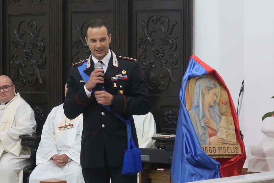 L’Arcivescovo ha concluso affidando gli uomini e le donne dell’Arma a Maria la madre del Signore, la Virgo Fidelis. “La mostra fotografica – ha detto – che inaugureremo al termine di questa celebrazione fissa, con i linguaggi dell’arte, la profonda attenzione dell’Arma dei Carabinieri per il territorio, con il suo patrimonio storico-artistico, e per la devozione mariana. Ella, Maria, può comprendere le vostre difficoltà e sostenervi nell’impegno di superarle. Continuate ad invocarla con le parole della vostra bella preghiera, affinché in ogni circostanza accompagni la vostra vigilanza, sostenga il vostro sacrificio, infiammi la vostra devozione”. Ha espresso, infine, un sentito ringraziamento al Colonnello Nicola De Tullio, al Tenente Colonnello Vincenzo Bulla e al Capitano Annamaria Putortì, nonché a tutta l’Arma dei Carabinieri per aver promosso la mostra fotografica.