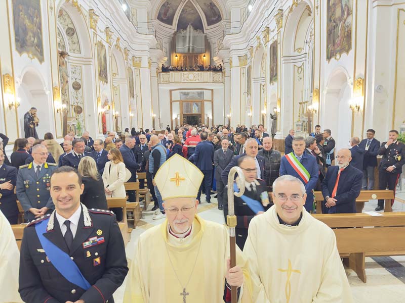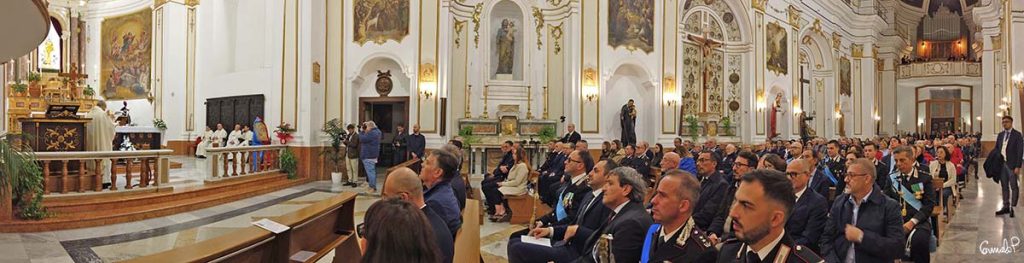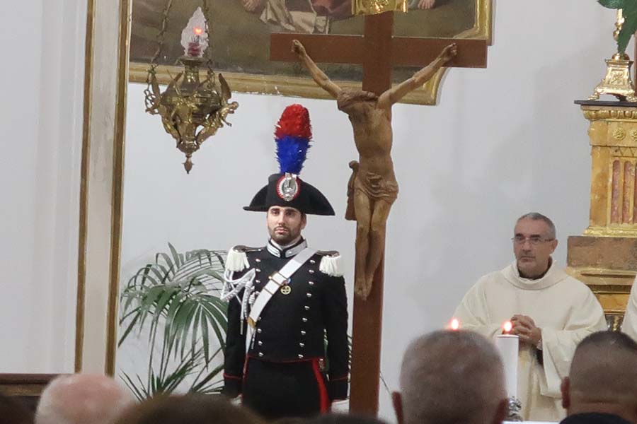 Mons. Alessandro Damiano nel suo intervento omiletico ha espresso stima per l’opera del’Arma “a favore dell’ordine pubblico e della custodia del bene comune per il civile progresso del nostro Paese. Voi siete – ha detto – uomini e donne d’ordine, educati ad un alto senso del dovere, “nei Secoli Fedele” è il vostro motto. Fedeli a che cosa? Si è chiesto. Ed ha risposto condividendo le parole di San Giovanni Paolo II, rivolte proprio ad un gruppo di Carabinieri nel maggio dell’88: «Fedeli anzitutto alla Legge divina scritta nel cuore di ogni essere umano; e fedeli poi alle leggi che regolano la comunità nazionale. Fedeli, e quindi pronti a difenderle anche con la vita, come avete tante volte provato, per consentire a tutti di vivere nella giustizia e nella pace. Questa è la vostra esemplare tradizione, che ha sfidato il tempo e il succedersi di tante vicende storiche. E se questa è una fedeltà condivisa da tutti coloro che si sono impegnati nell’Arma con solenne giuramento, lo è ancor di più da quelli tra loro che sono credenti. Essi trovano il loro campo di impegno là dove la Provvidenza li ha posti, per ordinare e trasformare il mondo non secondo mode passeggere o interessi di parte, ma secondo gli eterni valori posti dal Creatore a fondamento della vita e della pace: la verità e la libertà, la solidarietà e la giustizia. Chi è fedele a Dio, lo è anche agli uomini. Come è bello pensare che, attraverso la disciplina del vostro servizio, potete raggiungere una maturità umana e cristiana che diventa anche nella vita civile una garanzia di ordine e di moralità! È maturo colui che sa assumere le sue responsabilità». Purtroppo – ha proseguito – , proprio per il servizio che svolgete, voi siete non di rado oggetto dell’odio e della violenza di chi non accetta le regole della civile convivenza. Le numerose vittime che l’Arma ha dovuto registrare nel corso degli anni, dimostrano quanto sia rischiosa la vostra professione, desidero ricordarle tutte con paterna riconoscenza.