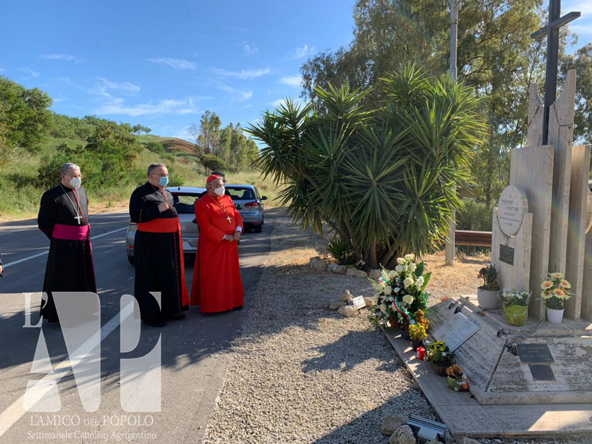 Il Card. Semeraro, con il card. Montenegro e mons. Damiano sulla Stela commemorativa dell’assassino di RosarioLivatino sulla ss640. (ph. Archivio “L’Amico del Popolo”