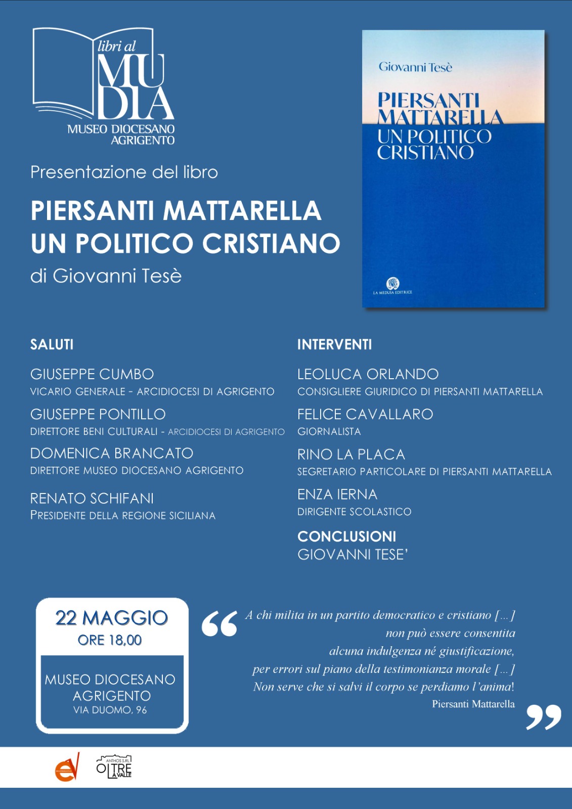 La presentazione del libro, che consentirà l’approfondimento del cristiano e politico PiersantiMattarella si svolgerà il 22 maggio alle ore 18,00 nelle sale del Museo Diocesano di Agrigento in Via duomo 96. Il direttore, dott.ssa Domenica Brancato, ha reso noto che oltre all’autore saranno presenti il presidente della Regione Siciliana Renato Schifani e Leoluca Orlando, Felice Cavallaro, Rino La Placa e Enza Ierna come relatori.