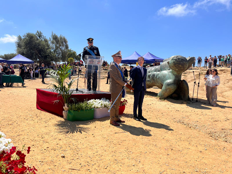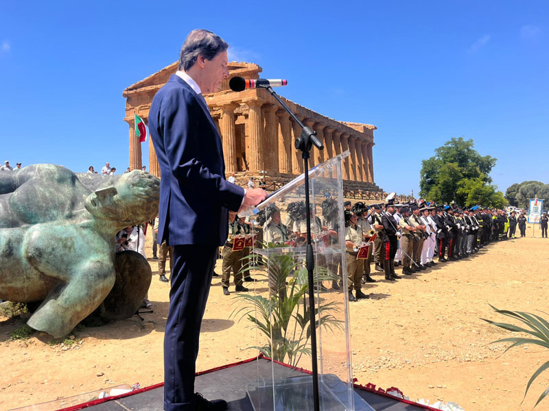 Nella suggestiva cornice offerta dal Tempio della Concordia, invece, si è svolta la celebrazione militare, aperta dall’alzabandiera e dal Canto degli italiani – intonato dal Tenore Francesco Grollo accompagnato dalla Fanfara dei Bersaglieri –, proseguendo con la consueta rassegna del picchetto interforze – composto da militari dell’Esercito italiano, Capitaneria di Porto-Guardia costiera, Arma dei Carabinieri, Guardia di Finanza, Polizia di Stato, Vigili del Fuoco, Polizia Municipale e Provinciale, Corpo Forestale della Regione siciliana e rappresentanze delle organizzazioni di volontariato e protezione civile – e la resa degli onori alla Bandiera nazionale e a S. E. il Prefetto.