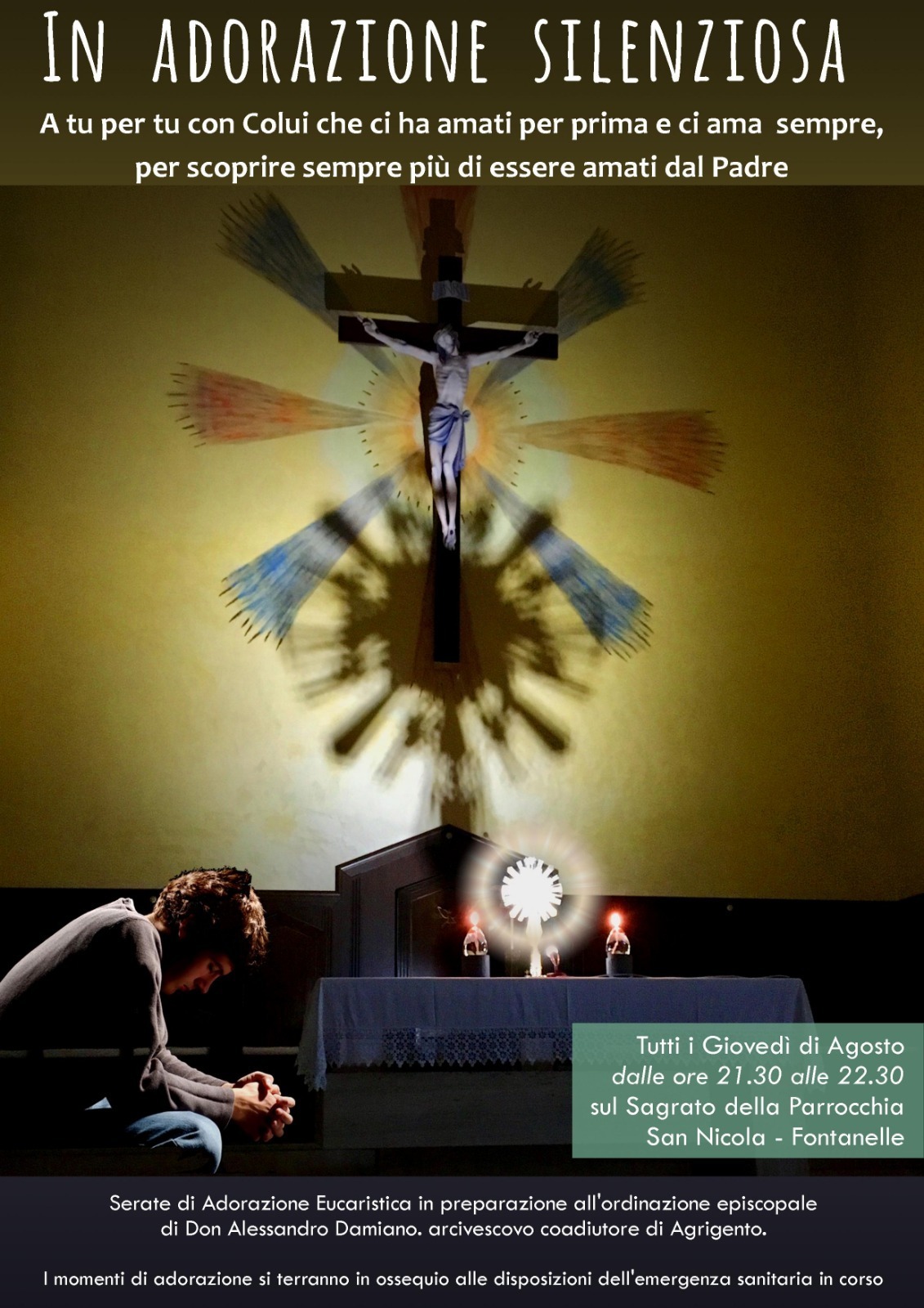 L’Adorazione Eucaristica in preparazione dell’Ordinazione di don Alessandro Damiano. Tutti i giovedì di Agosto si terrà , in comunione con la Chiesa agrigentina – dalle ore 21.00 alle 22.30 – sul sagrato della Parrocchia,  un momento di Adorazione eucaristica silenziosa, in ossequio delle disposizioni dell’emergenza sanitaria in corso.