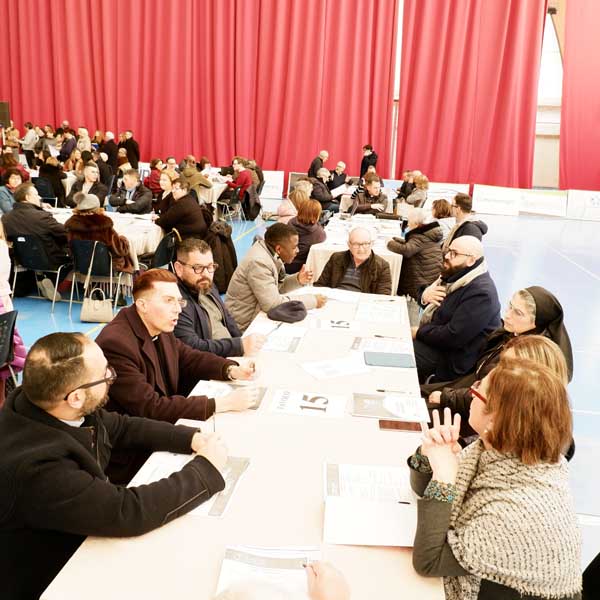 L’Assemblea ha avuto inizio con un momento di accoglienza dei delegati e la preghiera, con l’ascolto della Parola, l’invocazione dello Spirito e una breve riflessione dell’Arcivescovo che, commentando l’introduzione allo strumento di lavoro della prima Assemblea del Cammino sinodale delle Chiese che sono in Italia ha richiamato l’esigenza di una riforma ecclesiale che comporta una triplice conversione: comunitaria, personale e strutturale (cf. Evangelii gaudium, 27). “Scopo del Cammino sinodale – ha detto – non è tanto di produrre altra carta, per quanto sia necessario anche elaborare dei testi, ma proseguire nell’esperienza di uno stile, quello sinodale, che già sta diventando prassi nelle nostre Chiese e che ora domanda di potersi consolidare e disporre di strumenti perché diventi anche fatto strutturale”. Successivamente attraverso il metodo dei tavoli sinodali e della conversazione nello Spirito, gli oltre 450 rappresentanti della Chiesa agrigentina tra presbiteri, diaconi, laici, consacrati, membri degli organismi di partecipazione diocesani e parrocchiali, unitamente all’Arcivescovo Alessandro, si sono posti in ascolto di ciò che lo Spirito suggerisce alla Chiesa per mezzo del contributo di ciascuno.