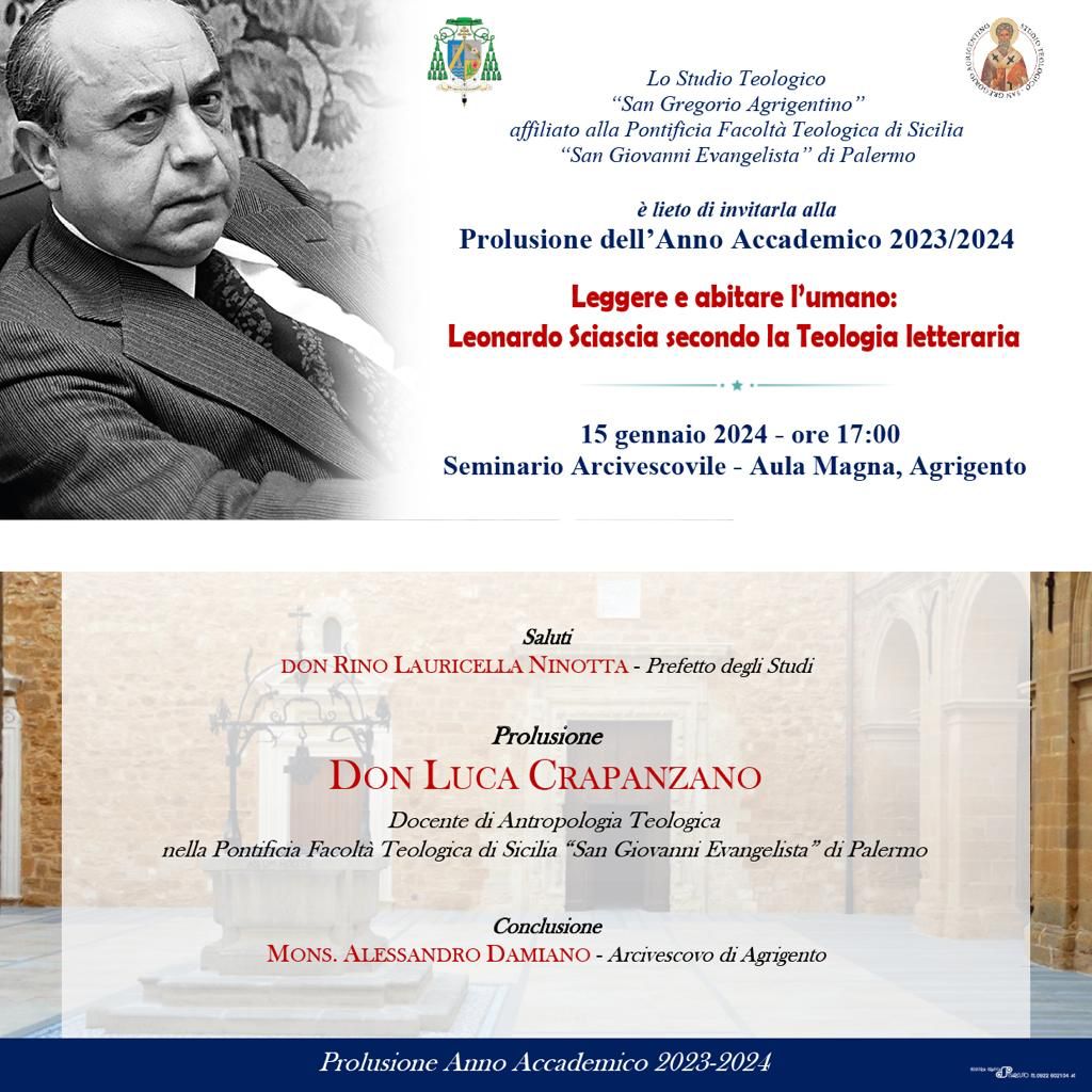 Lo studio Teologico “San Gregorio Agrigentino”(STSA, il 15 gennaio 2024, alle ore 17:00, nell’Aula Magna del Seminario Arcivescovile di Agrigento, vivrà un momento di vita accademica con la prolusione, inaugurando così il suo anno accademico. Il tema della prolusione “leggere e abitare l’umano: Leonardo Sciascia secondo la Teologia letteraria” è affidato al prof. Luca Crapanzano, docente di Antropologia Teologica alla pontificia facoltà teologica di sicilia.