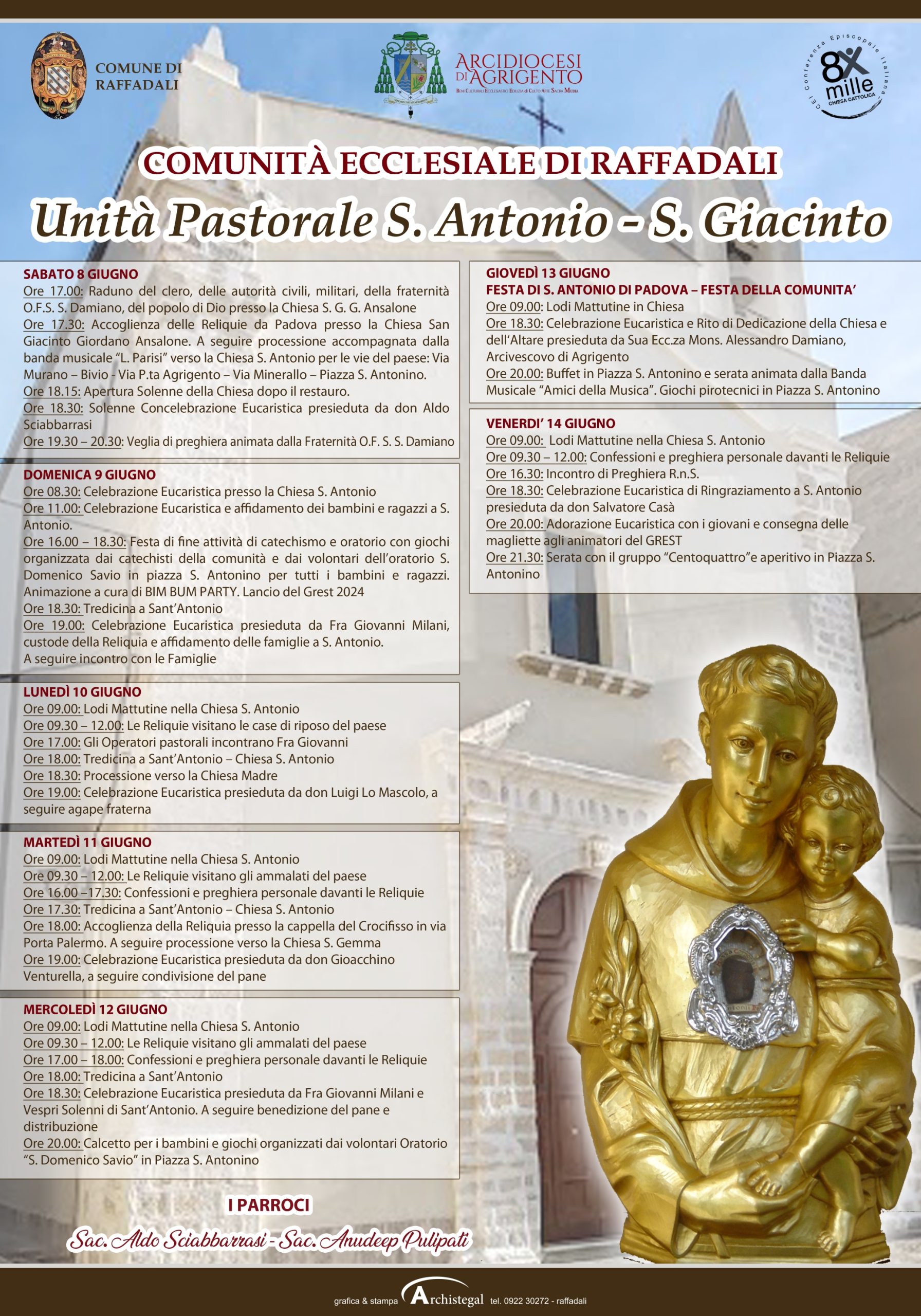 La comunità di Raffadali si prepara ad accogliere, da sabato 8 a venerdì 14 giugno, le reliquie di Sant’Antonio da Padova, in occasione della riapertura della chiesa omonima dopo i lavori di restauro. (vedi programma)