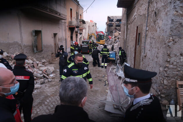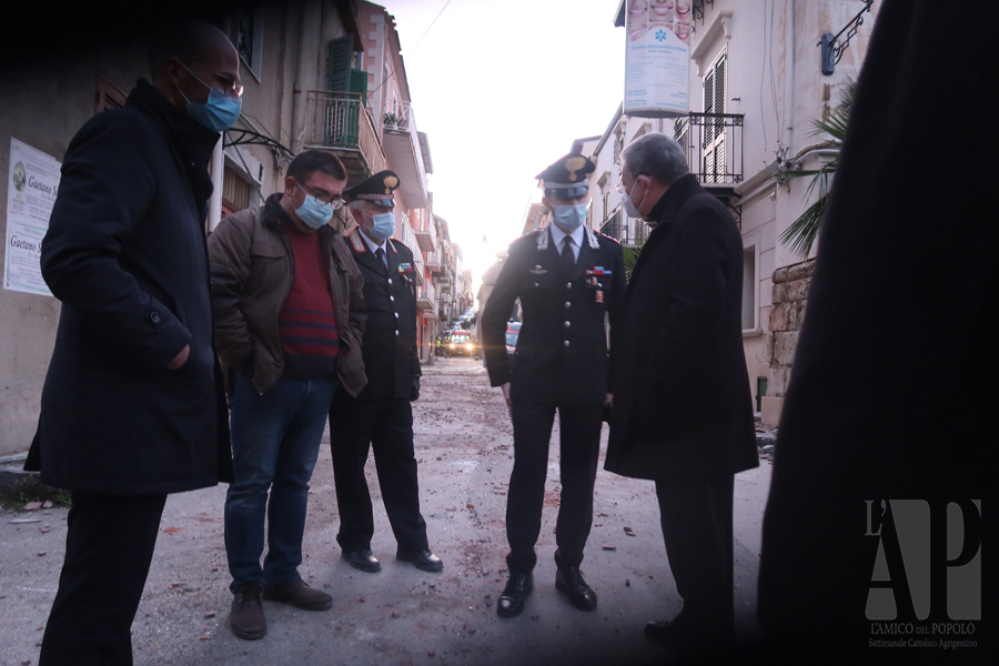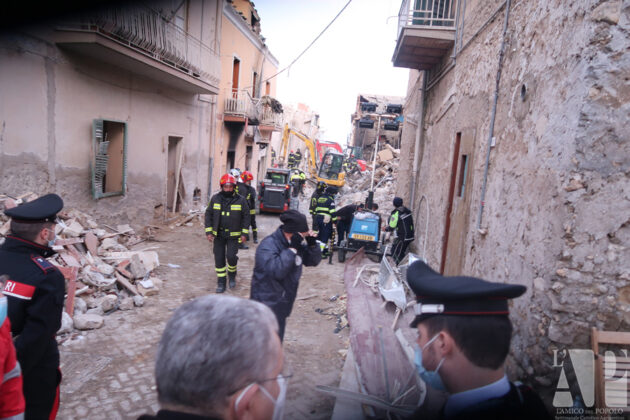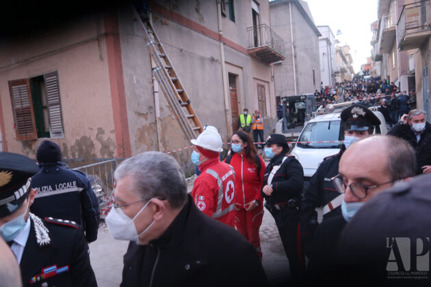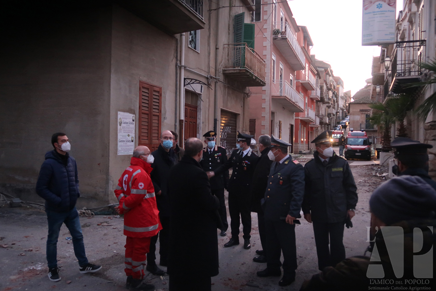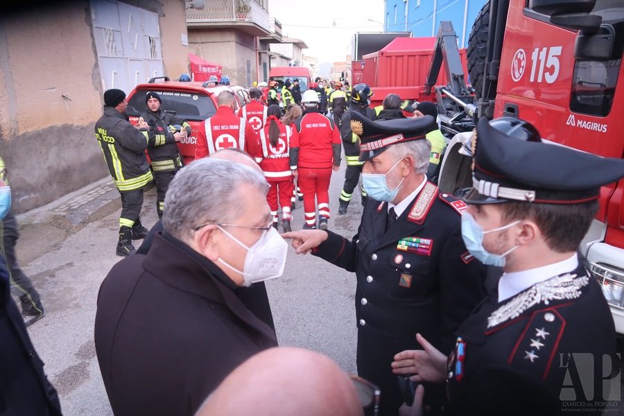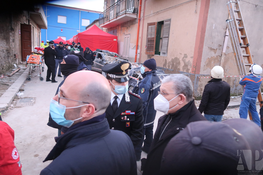 Si è, successivamente, recato nella zona rossa, accompagnato dal parroco della Matrice, don Filippo Barbera e dai rappresentanti dell’Arma dei Carabinieri tra gli edifici colpiti dalla forza dell’esplosione. Mentre i Vigili del Fuoco, le Forze dell’ordine ed i Volontari, continuavano il lavoro di rimozione delle macerie, a distanza, una folla di cittadini, amici e parenti, da ieri sera, ha gli occhi rivolti agli edifici crollati ed al lavoro infaticabile dei soccorritori, in attesa di un segnale di speranza per le persone disperse.