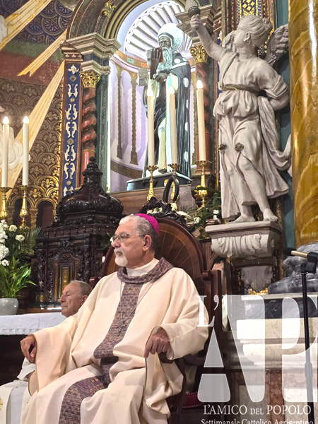 Mons. Damiano ha iniziato il suo intervento omiletico ritornando su uno scritto di mons. F. Sortino citato il 18 giugno scorso, memoria liturgica di san Calogero. «Ad un devoto di san Calogero – scriveva mons. Sortino – dicevo tempo fa: “Ma perché onorare il Santo in una forma così chiassosa e disordinata da dare l’impressione di un baccanale? Guardi come sono composte, devote, edificanti le processioni del Corpus Domini, dell’Immacolata, del Venerdì Santo! … Veda, mi rispose, se venisse il Papa in Agrigento, noi accorreremmo devoti, composti, ci inginocchieremmo al suo passaggio, applaudiremmo nel modo più civile. Ma se viene un parente o un carissimo amico che non vediamo da tempo, ci precipitiamo ad abbracciarlo, baciarlo, gli diamo delle pacche sulle spalle, stappiamo bottiglie e facciamo chiasso per festeggiarlo!».Torno a ripeterlo,  ha detto mons. Damiano –  la pietà popolare ha ragioni che la liturgia non ha. Tuttavia possiamo dichiararci autenticamente suoi devoti – di san Calogero così come di Antonio, Francesco d’Assisi, di Paola … – solo se ne seguiamo l’esempio; e possiamo onorarne la memoria solo se la facciamo rivivere nelle nostre scelte e nelle nostre azioni. Può accadere, e accade – ha detto ai fedeli devoti che gremivano il Santuario – che non sia un bello spettacolo quello che date, di voi stessi, della Città, della Chiesa. Lo so, così va la vita, a volte male; ma non è necessario che vada sempre così.