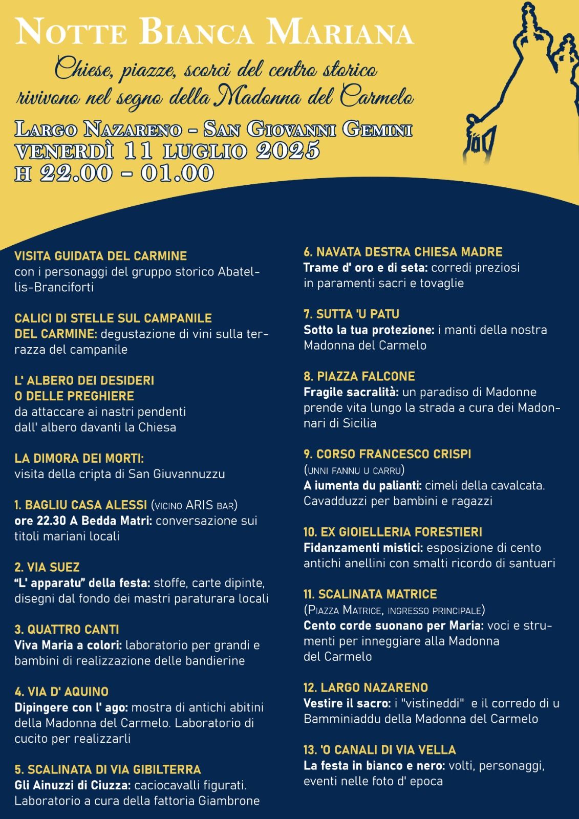 Chiese, piazze, vicoli, vaneddi del centro storico di San Giovanni Gemini rivivranno nel segno della Madonna del Carmelo in occasione della Notte bianca mariana di venerdì 11 luglio 2025. Mostre, laboratori per bambini e ragazzi, conversazioni, degustazioni di vino, aperture straordinarie di luoghi abitualmente segreti animeranno le postazioni lungo l’ asse di Largo Nazareno.