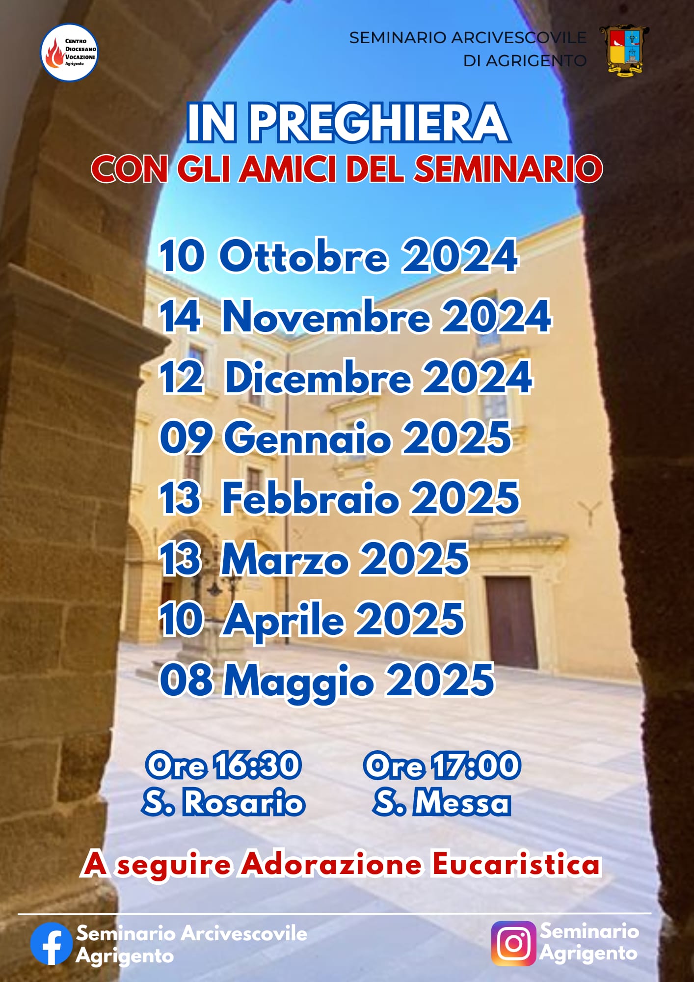 La Preghiera con gli amici del Seminario (vedi locandina) seguirà il seguente orario e calendario : Ore 15:30 Rosario; ore 17:00 S.Messa a seguire l’Adorazione Eucastistica.