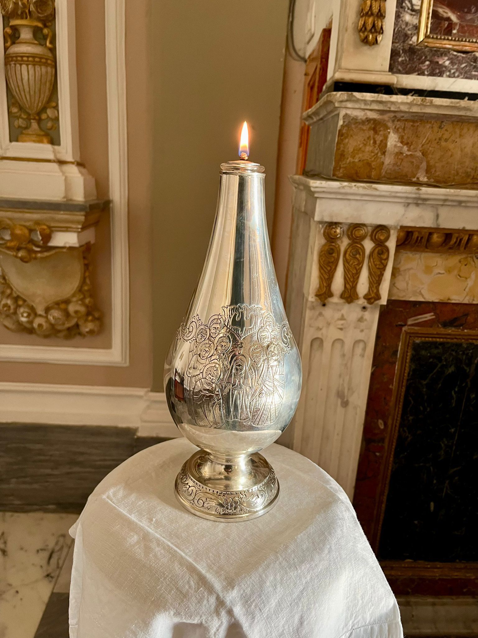 Si riprende così una tradizione iniziata nel 2007, sotto il rettorato di don Giuseppe Argento quando venne realizzata e accesa per la prima volta. Su di essa è incisa la scena evangelica della discesa dello Spirito Santo su Maria e gli apostoli riuniti nel cenacolo è l’invocazione allo Spirito: “Veni, creator Spiritus altissimi donum Dei, fons vivus, ignis, caritas et spiritalis unctio”.