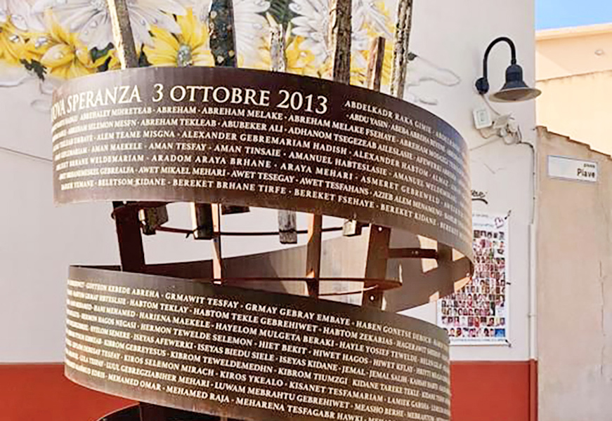 il passo alla tenue luce dell’aurora, prima che il sole spunti all’orizzonte e non solo per i pescatori, abituati al duro lavoro dell’andare per mare anche di notte. Poco prima di quell’ora, mentre i gabbiani iniziano a garrire, pian piano la centralissima via Roma e Piazza Piave cominciano a popolarsi proprio quando generalmente, turisti e isolani, anche in questo caldissimo ottobre, così come durante la stagione turistica, vanno a dormire e gli esercenti chiudono i locali. Quel giorno e a quell’ora – la stessa di quel tragico giovedì, 3 ottobre del 2013, quando un barcone con migranti eritrei prese fuoco e si rovesciò a circa mezzo miglio dall’Isola dei Conigli, provocando la morte di 368 persone – ci sono tutti: isolani, turisti e ospiti appositamente giunti sull’Isola. Ci sono soprattutto “i pescatori di vite umane” – come li ha definiti Alessandro Puglia – che quel giorno salvarono i superstiti del naufragio anch’essi in piazza con amici e parenti. Il momento di raccoglimento, fatto di ascolto dei testimoni e di silenzio, ogni anno, come una clessidra che si capovolge, segna un andare indietro nel tempo, fino a quell’alba di dieci anni fa. Da quel giorno, ogni 3 ottobre, il buio della notte è squarciato dai lumicini accesi in mano alla gente o sui davanzali delle case e, dal 2019, attorno al Memoriale “Nuova Speranza”, in Piazza Piave