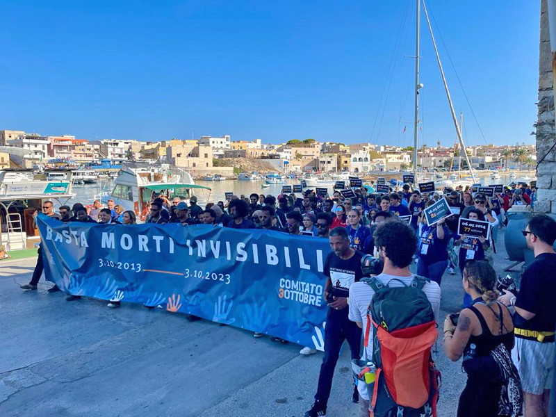su cui sono incisi i nomi dei migranti morti che sono stati letti, uno ad uno, davanti al monumento che li ricorda, rompendo, così, il silenzio della notte per ricordare a tutti che dietro ogni numero, di questa e delle altre tragedie, c’è una persona, con un nome, un volto, una famiglia, una storia; poi la marcia verso Porta d’Europa, cerniera simbolica tra Europa e Africa, per il momento di raccoglimento con i familiari delle vittime, alla presenza di cittadini e delle autorità, civili, religiose e militari. Ad aprire il corteo uno striscione con la scritta: “Basta morti invisibili” portato da centinaia di studenti giunti da diversi Paesi europei, insieme a cartelli con su stampati i numeri delle vittime dei naufragi. Tante volte, troppe, la data del 3 ottobre è stata utilizzata come limite, come confine di una tragedia che non si sarebbe dovuta più ripetere. “Mai più!” dissero i grandi dell’Europa inginocchiati davanti le centinaia di bare, allineate nell’hangar dell’aeroporto dell’isola. “Non si ripeta per favore!” ha chiesto Papa Francesco, in visita a Lampedusa l’8 luglio dello stesso anno, per gli altri naufragi in mare. Quella strage, purtroppo, non è servita a fermare le tante altre che, nel tempo, si sono succedute. Da più parti in Europa e nel Paese, anche ieri sono risuonate parole- che sembrano infrangersi come onde sugli scogli dell’isola- circa la necessità di un cambio di approccio nelle politiche migratorie. Nel mentre assistiamo ancora a schermaglie tra il Governo e le navi umanitarie delle ONG, a controversie con la Magistratura, a dichiarazioni, promesse, sottoscrizione di intese e patti che sembrano scene di un film già visto e rivisto. Assistiamo ancora ad una UE che sembra mostrarsi, al di là dei proclami, non una Unione di Stati Europei, ma “UE” appunto, acronimo di “Unione di Egoismi”, sempre più marcati tra gli Stati, con aperture e repentini arroccamenti e tentativi, quasi quotidiani, di ricucire la trama dei rapporti tra gli Stati, dell’Italia con Francia e Germania, a casa nostra, anche tra gli stessi partiti di Governo. In questo scenario liquido, abbiamo celebrato l’anniversario di quella terribile tragedia, per non dimenticare i morti e le loro famiglie, il dramma delle guerre, delle persecuzioni e della miseria, da cui essi fuggivano. Il 3 ottobre di dieci anni fa, per la prima volta i morti