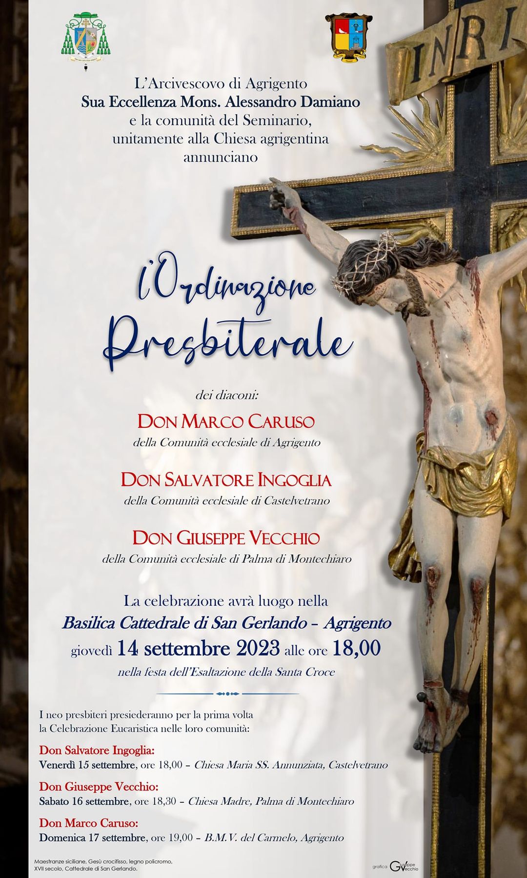 Giovedì 14 settembre 2023, festa liturgica dell’Esaltazione della Santa Croce,alle ore 18:00, nella Cattedrale di Agrigento, l’arcivescovo ordinerà presbiteri i diaconi Marco Caruso della comunità ecclesiale di Agrigento, Salvatore Ingoglia della comunità ecclesiale di Castelvetrano e Giuseppe Vecchio della comunità di Palma di Montechiaro.