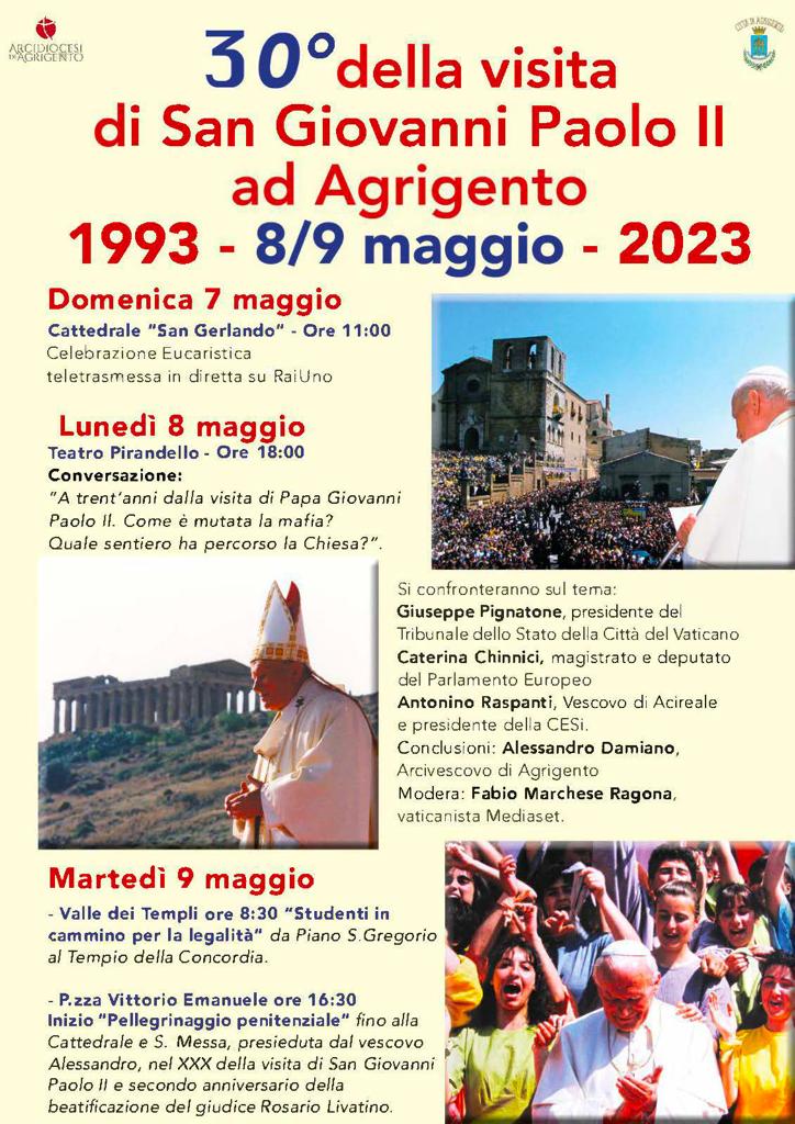 • Lunedì 8 maggio Teatro Pirandello, alle ore 18:00 si terrà Conversazione: ”A trent’anni dalla visita di Papa Giovanni Paolo II. Come è mutata la mafia? Quale sentiero ha percorso la Chiesa?”. Sul tema – dopo il saluto del sindaco di Agrigento, Francesco Miccichè, moderati dal vaticanista di Mediaset, Fabio Marchese Ragona –  si confronteranno: Giuseppe Pignatone, presidente del Tribunale dello Stato della Città del Vaticano, Caterina Chinnici, magistrato e deputato del Parlamento Europeo,  Antonino Raspanti, Vescovo di Acireale e presidente della CESi. Concluderà i lavori Alessandro Damiano, Arcivescovo di Agrigento.