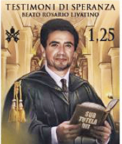 Vignetta: raffigura il beato Livatino con un libro tra le mani che reca il motto “SUB TUTELA DEI” con cui suggellava le pagine del proprio diario. Sullo sfondo è tratteggiata la Cattedrale di Agrigento dove si è svolta la cerimonia di beatificazione. (vedi)